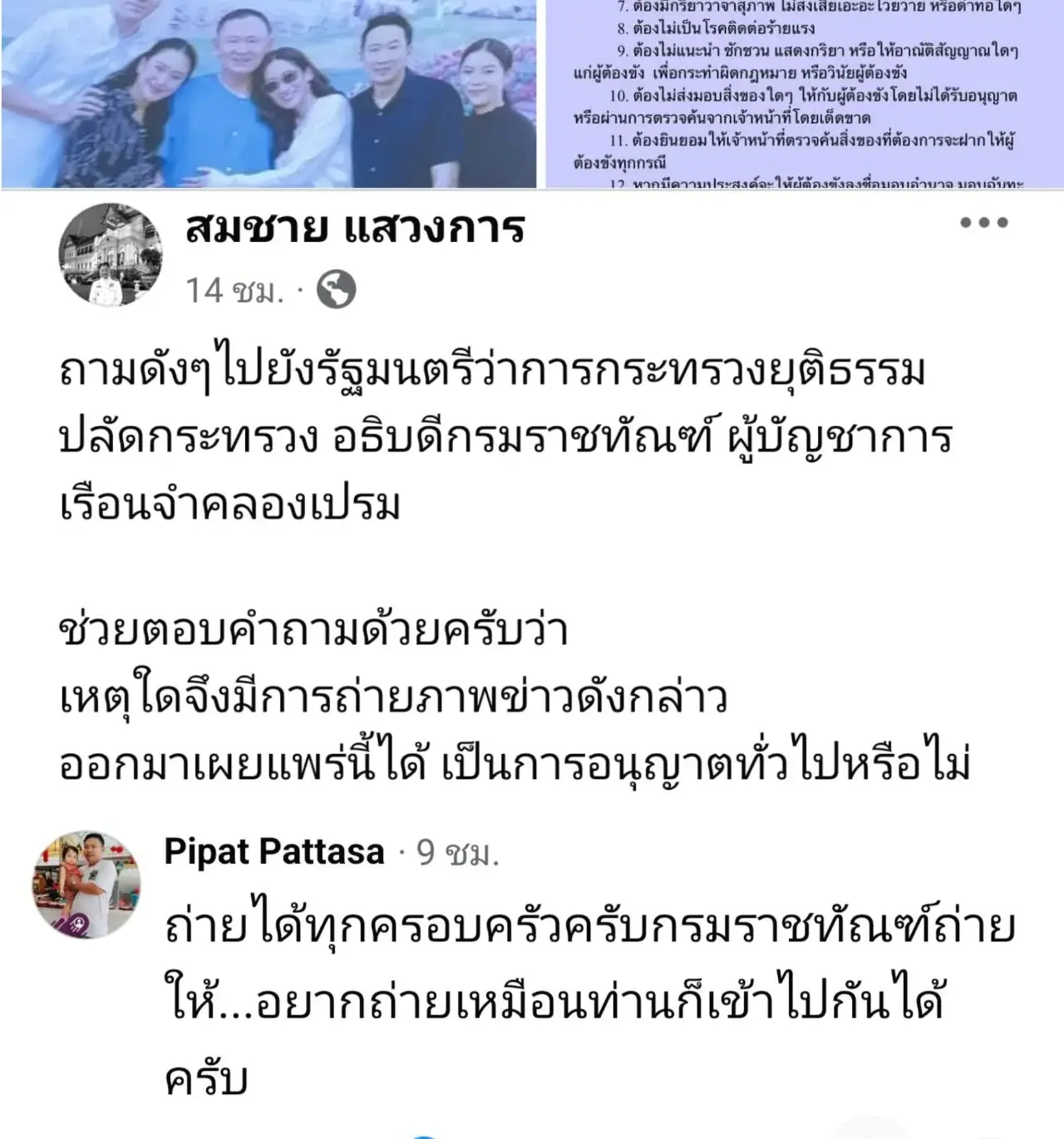 ต่อมาก็ได้มีการเผยแพร่ภาพดังกล่าวในโซเชียลจากกรณีนี้เองจึงได้มีการตั้งคำถามจากอดีตสว. สมชายที่ได้มีการโพสต์ถามดังๆไปถึง ต่อมาทางเรือนจำคลองเปรมก็ได้มีการออกมาชี้แจงระบุว่า เป็นโครงการ ถ่ายภาพร่วมกับครอบครัวซึ่งไม่ใช่อภิสิทธิ์ชนตามที่หลายฝ่ายมองกันสรุปก็คือทุกคนมีสิทธิเท่าเทียมกันในโครงการดังกล่าว