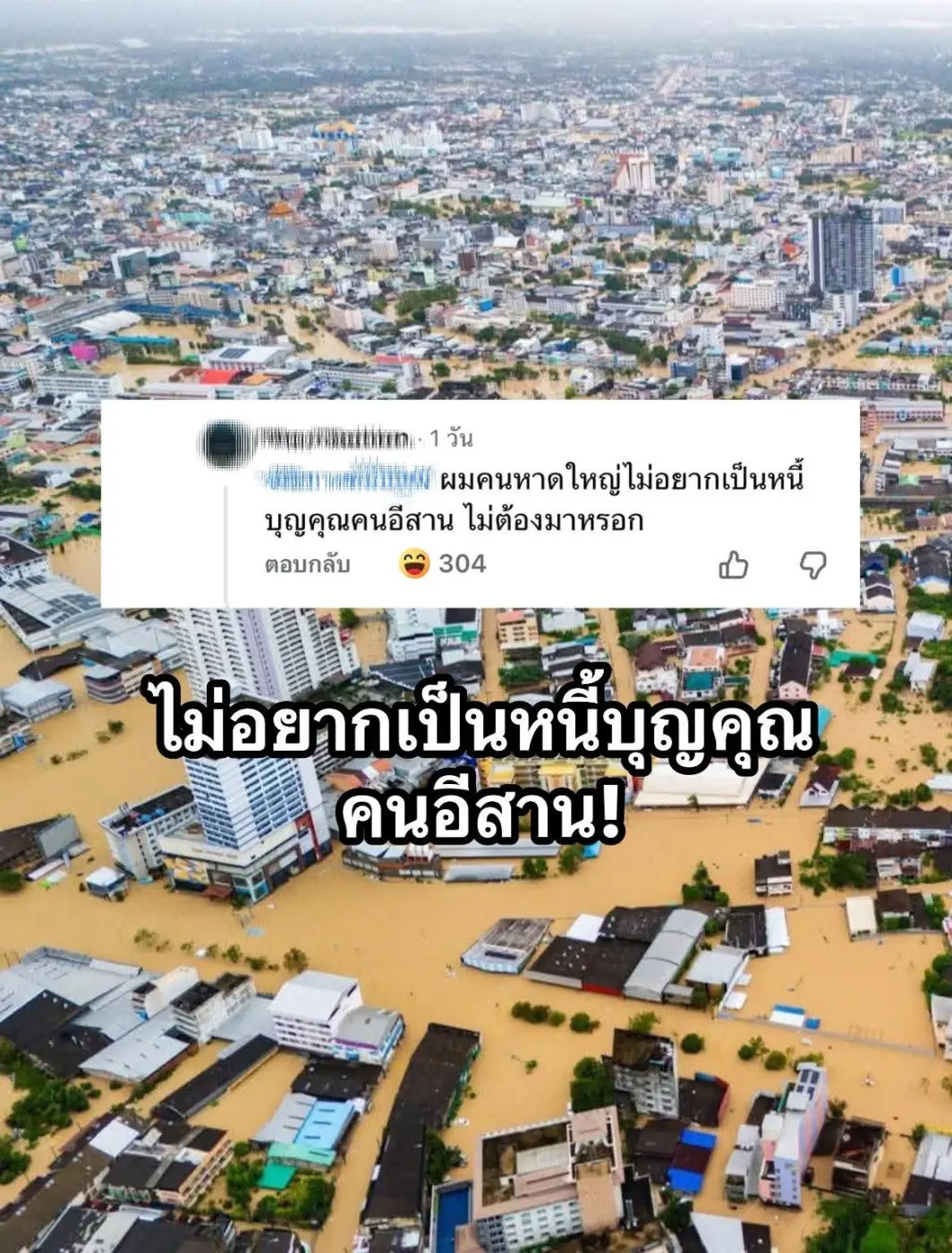 ชาวหาดใหญ่รายนึง แสดงความคิดเห็นไม่อยากเป็นหนี้บุญคุณคนอีสาน ไม่ต้องลงมาช่วยภัยพิบัติน้ำท่วมขัง