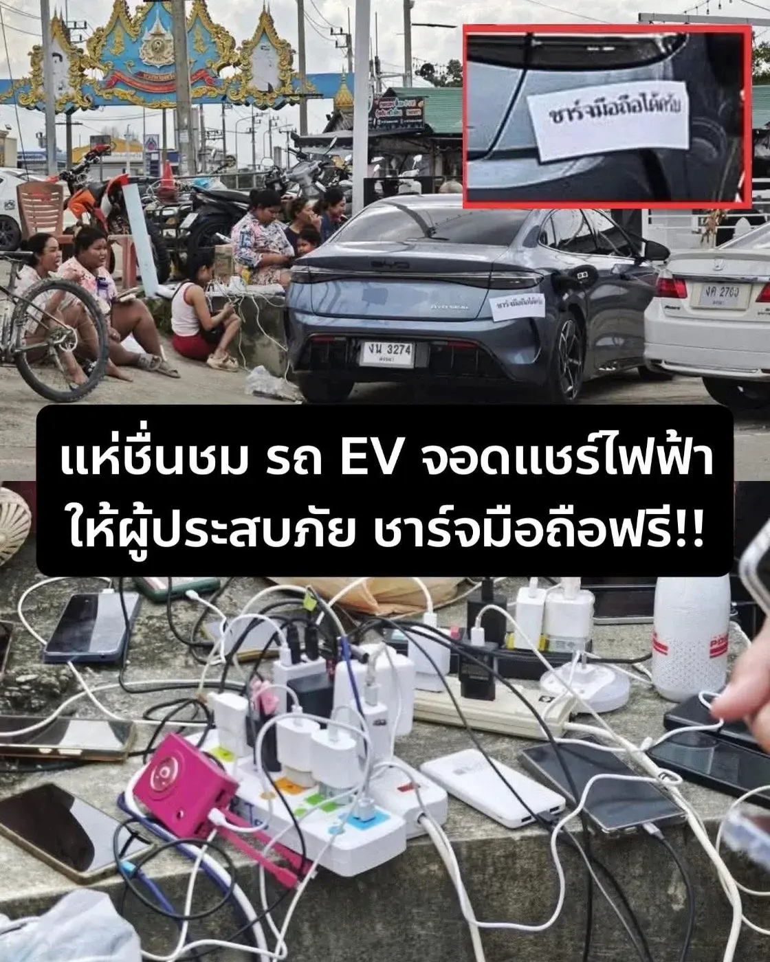 สืบเนื่องมาจากกรณีที่น้ำท่วมขังจังหวัดสงขลาโดยเฉพาะพื้นที่อำเภอหาดใหญ่ประชาชนได้รับความเดือดร้อนอย่างหนักซึ่งในขณะนี้น้ำท่วมขังเริ่มทยอยลดลงแล้วแต่ไฟฟ้าที่ถูกตัดไปยังไม่สามารถกลับมาใช้ได้ล่าสุด มีหนุ่มใจดีเจ้าของรถ EV ขับรถมาจอดข้างทางเปิดปลั๊กให้ชาวบ้านชาร์จแบตโทรศัพท์มือถือแบบฟรีๆเพราะรู้ดีว่า ในวันที่น้ำท่วมไม่มีใครมีไฟฟ้าใช้ รู้ว่ามันแย่แค่ไหนมือถือก็แบตหมดไม่สามารถติดต่อ กับโลกภายนอกได้ จะบอกกับญาติที่เป็นห่วงก็ไม่ได้จะเช็คข่าวอะไรก็ไม่ได้ ดังนั้นเจ้าของรถ EV คันนี้จึงขอเป็นที่พึ่งให้กับชาวบ้าน จะได้มีแบตไว้ใช้ติดต่อญาติๆได้นะ