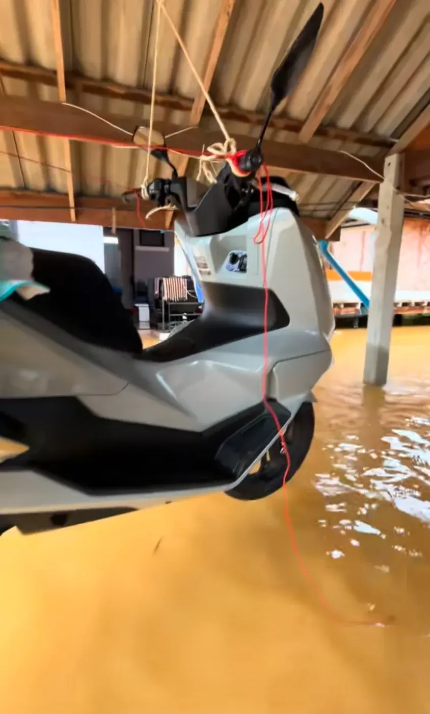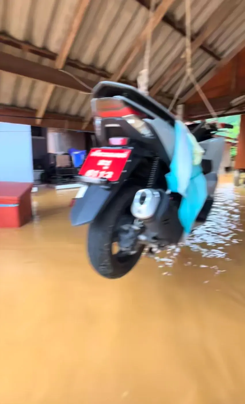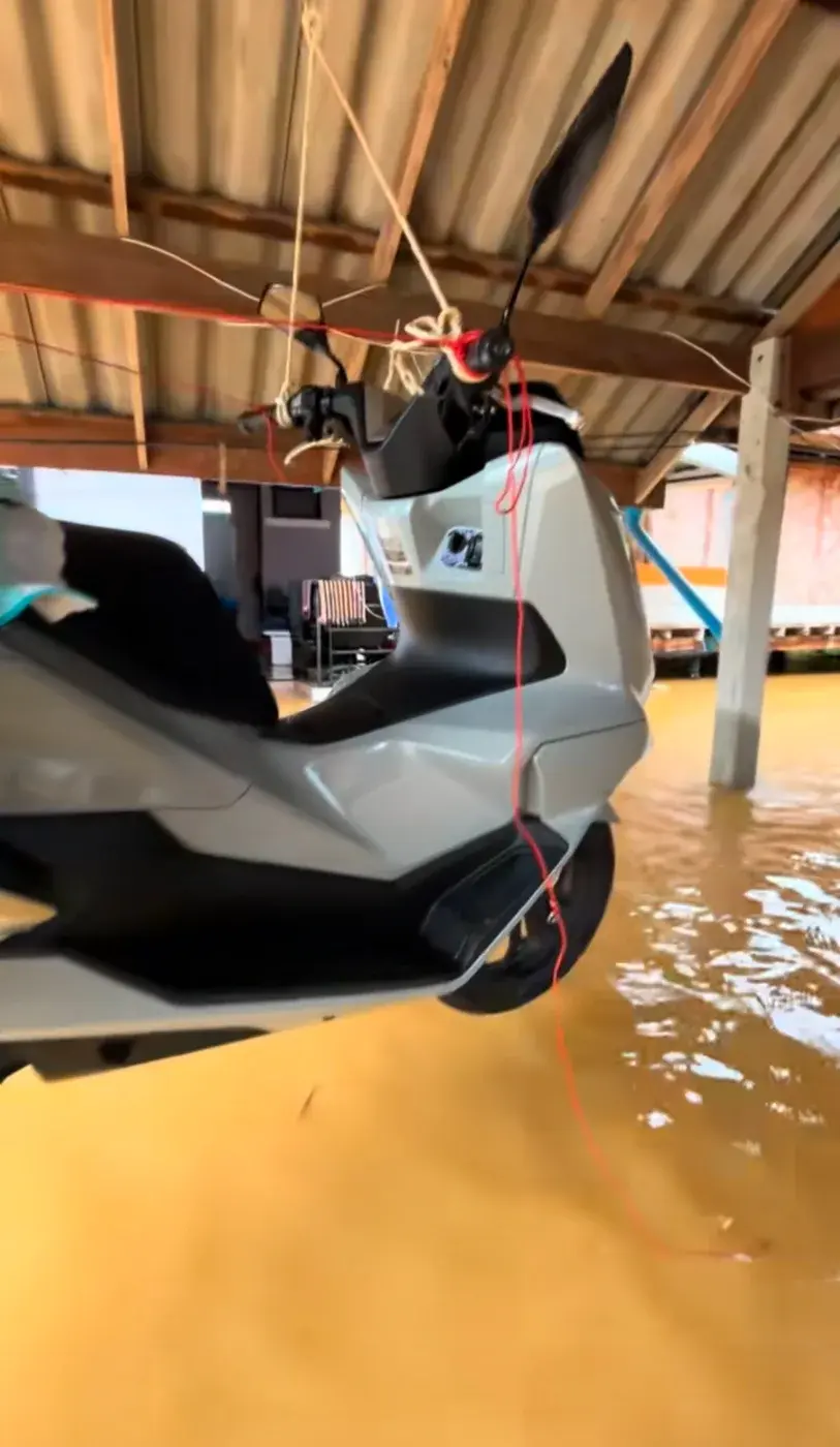 ฮือฮาทั่วโซเชียลเมื่อผู้ประสบภัยในจังหวัดสตูลนำรถจักรยานยนต์ห้อยเชือกผูก โรงจอดรถ