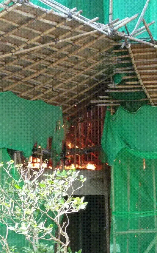 ในคลิปจะเห็นได้ว่า ไฟลุกขึ้นจากนั่งร้านไม้ไผ่บริเวณด้านล่างอาคาร ก่อนจะลามขึ้นไปตามโครงไม้ไผ่อย่างช้า ๆ จากนั้นเมื่อไม้ไผ่ติดไฟก็เกิดเสียงระเบิดดังขึ้น...