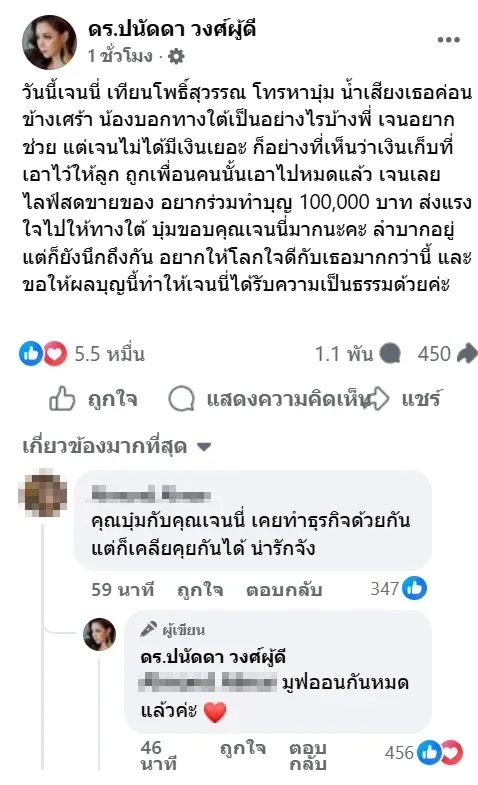 เจนี่ เทียนโพธิ์สุวรรณ โทรหาบุ๋ม-ปนัดดา วงศ์ผู้ดี เพื่อสอบถามเกี่ยวกับสถานการณ์น้ำท่วมในภาคใต้และความเป็นอยู่ของประชาชนที่ได้รับผลกระทบ โดยเจนี่ต้องการช่วยทำบุญ แต่เงินเก็บที่ตั้งใจไว้ให้ลูกถูกเพื่อนเอาไปหมดแล้ว ทำให้เธอมีเงินน้อยในการช่วยเหลือครั้งนี้ บุ๋มเผยว่าเจนี่มีน้ำเสียงเศร้าและต้องการร่วมทำบุญ 100,000 บาท โดยไลฟ์สดขายของเพื่อระดมทุน บุ๋มขอบคุณเจนี่ที่ยังนึกถึงกันในช่วงลำบาก และหวังว่าผลบุญจะนำความเป็นธรรมมาให้เจนี่ด้วย นอกจากนี้ยังมีคนเข้ามาคอมเมนต์เกี่ยวกับความสัมพันธ์ระหว่างบุ๋มและเจนี่ที่เคยทำธุรกิจร่วมกัน แต่ตอนนี้ได้เคลียร์กันแล้ว