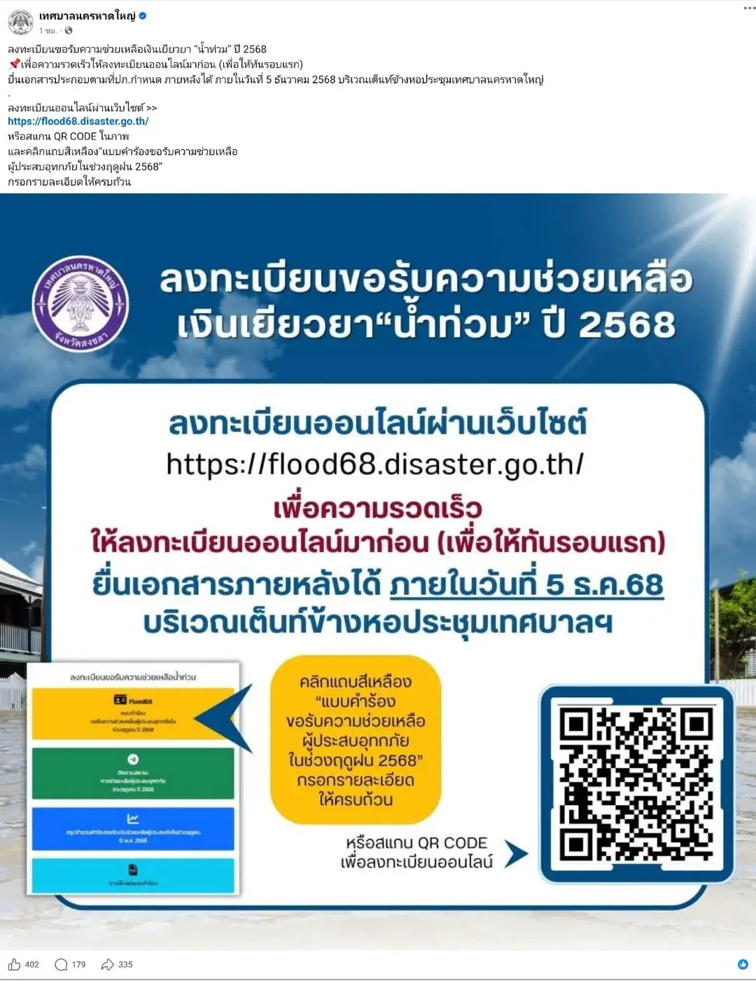 เทศบาลหาดใหญ่ประกาศให้ผู้ประสบภัยน้ำท่วมยื่นเอกสารตัวจริงภายในวันที่ 5 ธันวาคมนี้เพื่อขอรับเงินเยียวยา