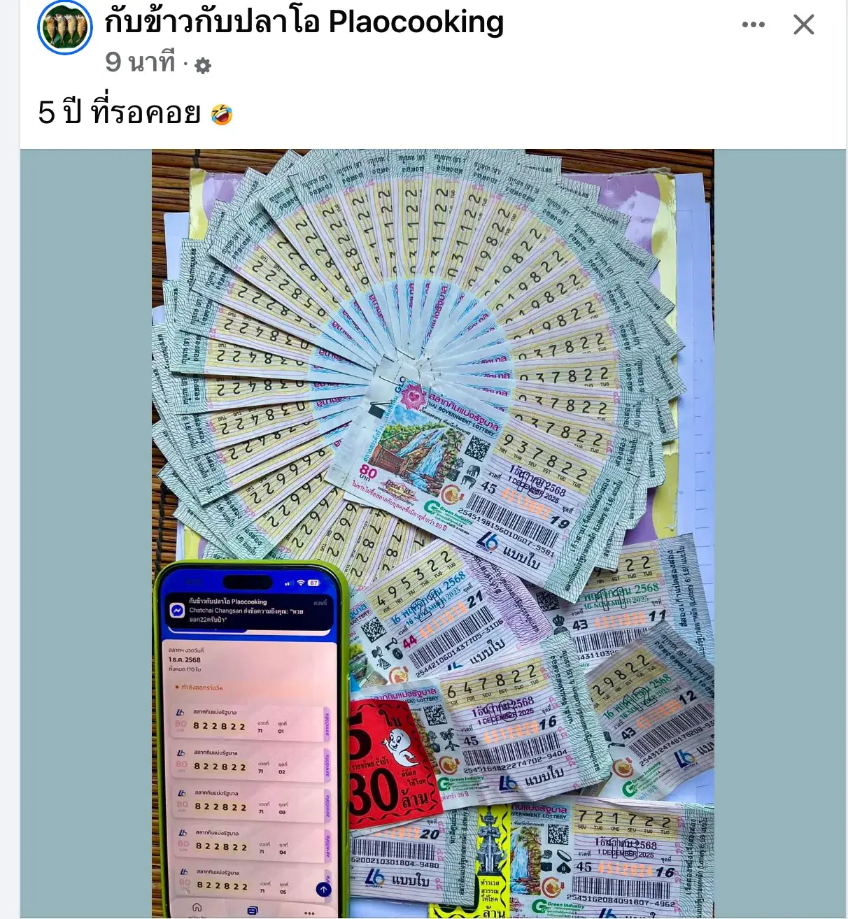 หลังจากที่ผลสลากกินแบ่งรัฐบาล งวดประจำวันที่ 1 ธันวาคม 2568 ได้ประกาศออกมา โดยเฉพาะรางวัลเลขท้าย 2 ตัว คือหมายเลข 22 ได้สร้างความยินดีให้กับนักเสี่ยงโชคทั่วประเทศ แต่ที่สร้างความฮือฮาเป็นพิเศษในโลกออนไลน์คือ เพจทำอาหารชื่อดังอย่าง "กับข้าวกับปลาโอ Plaocooking" ที่ความพยายามในการตามเลขที่ชื่นชอบมาตลอดได้สัมฤทธิ์ผล เมื่อ...เพจถูกรางวัลเลขท้าย 2 ตัว ในปึกใหญ่ถึง 33 ใบ ทำให้รับทรัพย์ก้อนโตไปอย่างเต็ม ๆ