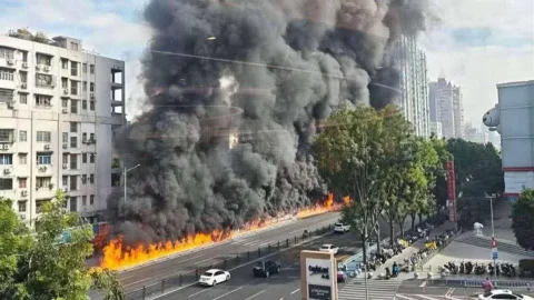 รถบรรทุกน้ำมันรั่วลามมอเตอร์ไซค์ไฟฟ้าเป็นแนวเพลิงยาว ชาวจีนเปรียบ “มังกรไฟคำราม