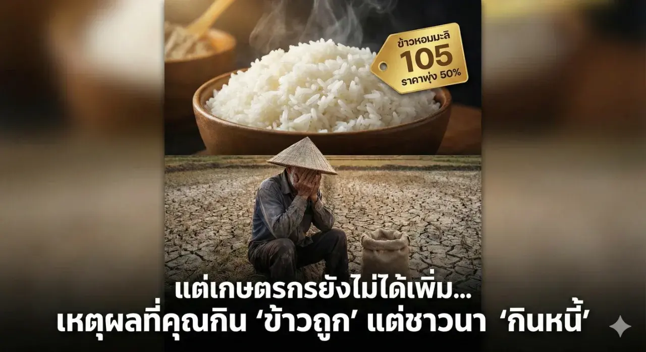 “ข้าวหอมมะลิ 105 ราคาพุ่ง 50% — แต่เกษตรกรยังไม่ได้เพิ่ม… เหตุผลที่คุณกิน ‘ข้าวถูก’ แต่ชาวนา ‘กินหนี้’”