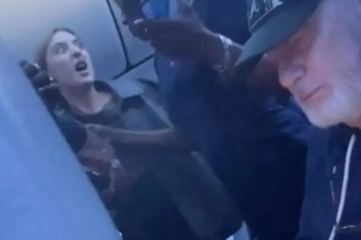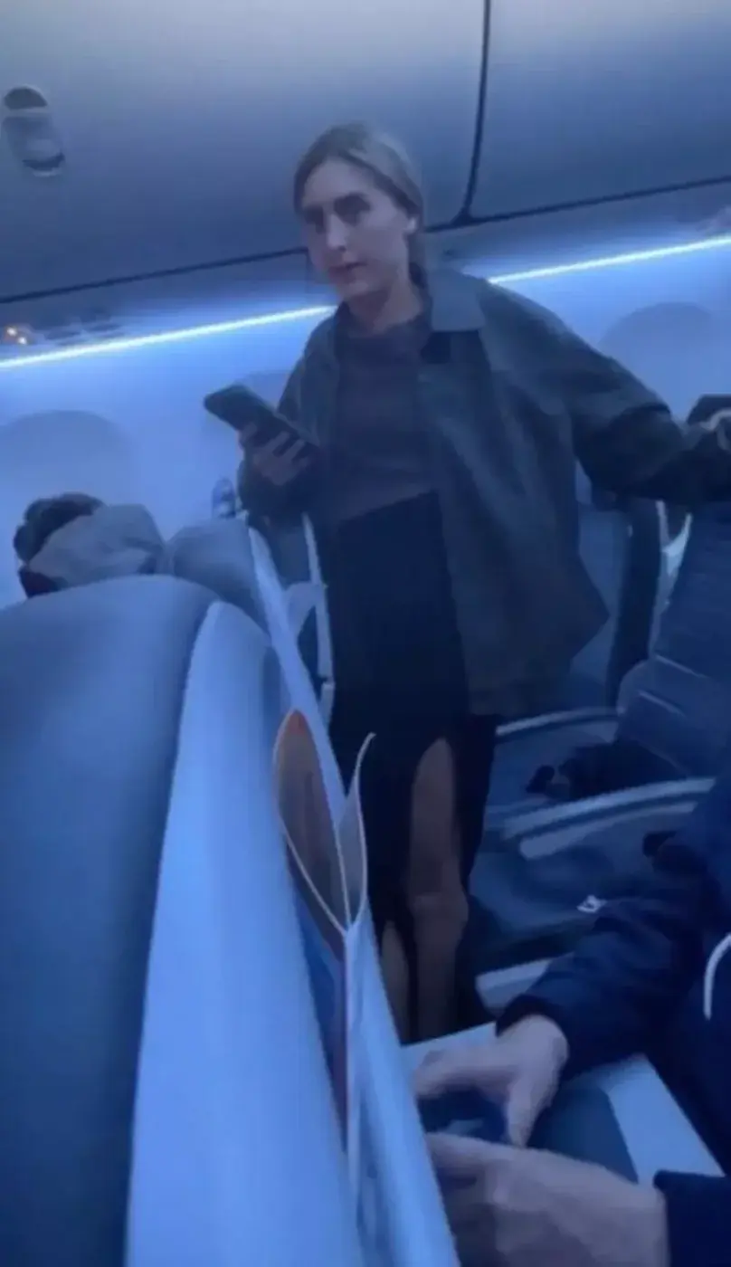 ในคลิปปรากฏให้เห็นหญิงผมบลอนด์ ที่นั่งติดหน้าต่างกำลังลุกออกจากที่นั่ง และ เดินสวนกับพนักงานต้อนรับที่เข้ามาเพื่อระงับเหตุ พนักงานไม่ได้พูดอะไร เพียงหยุดยืนรอให้เธอขยับตัว แต่ผู้โดยสารรายนี้กลับยิ่งแสดงความไม่พอใจ และ พูดจาไม่เหมาะสมใส่พนักงาน โดยเธอกล่าวว่า "ฉันจะลุกขึ้นนะ ฉันมีสิทธิ์จะลุก เมื่อพวกคุณทำให้เราติดอยู่บนลานจอดเป็นชั่วโมง ฉันก็มีสิทธิ์จะลุก" ซึ่งพนักงานตอบอย่างสุภาพว่า "ตายสบาบเลย" และ ขยับทางให้ ซึ่งดูเหมือนคำพูดสุภาพนี้ยิ่งทำให้ผู้โดยสารรายนี้ โมโหหนักกว่าเดิม และ เริ่มพูดหยาบคายใส่พนักงาน ในขณะที่เธอเดินจากไป หลังจากนั้น หญิงรายนี้มองเห็นว่ามีคนกำลังถ่ายวิดีโออยู่ เธอจึงหยุดพูด และ ดูเหมือนจะพยายามทำตัวให้สงบลง เมื่อรู้ตัวว่าอาจกลายเป็นไวรัลบนโซเชียล...