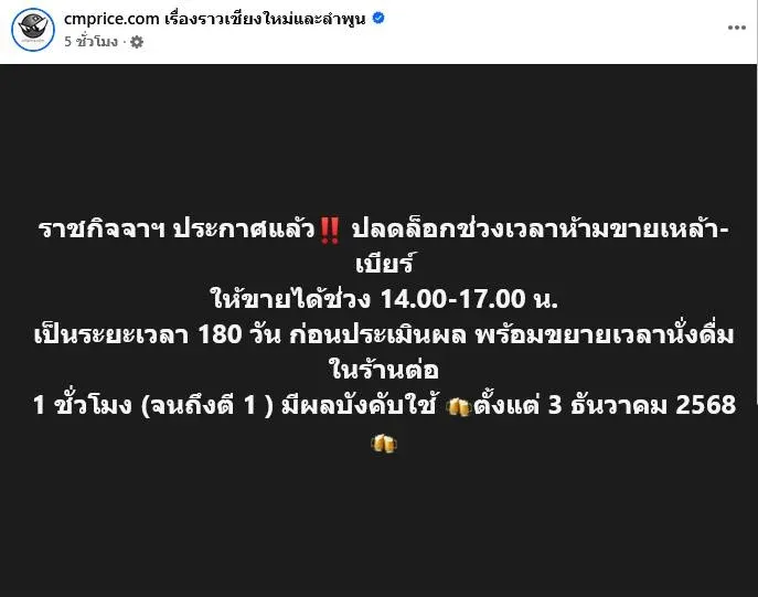 วันนี้ เพจเฟสบุ๊ก "cmprice.com เรื่องราวเชียงใหม่และลำพูน" ได้โพสต์ว่า "ราชกิจจานุเบกษา เผยแพร่ "ประกาศคณะกรรมการควบคุมเครื่องดื่มแอลกอฮอล์" เรื่อง "กำหนดเวลาห้ามบริโภคเครื่องดื่มแอลกอฮอล์ พ.ศ. 2568 ยกเว้นเป็นการขายตามเวลา ดังต่อไปนี้"