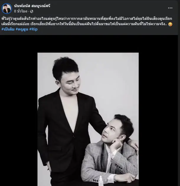 เฟซบุ๊กของ นันท์มนัส สมบูรณ์ศรี หรือพี่เป้ ได้โพสต์ข้อความอาลัยถึงครูตูนด้วยถ้อยคำสุดสะเทือนใจ พร้อมระบุว่า “พี่ไม่รู้ว่าตูนคิดหรือทำอะไรลงไป แต่ตูนรู้ไหมว่าการจากลามันเจ็บปวดที่สุด พี่คงไม่มีวันได้ยินเสียงตูนเรียกเติมมี่ เรียกแม่อ้อย หรือเรียกเฮียเป้อีกแล้ว พี่ภาวนาให้สิ่งที่เกิดขึ้นเป็นเพียงความฝัน อยากตื่นมาแล้วพบว่ามันไม่ใช่เรื่องจริง”