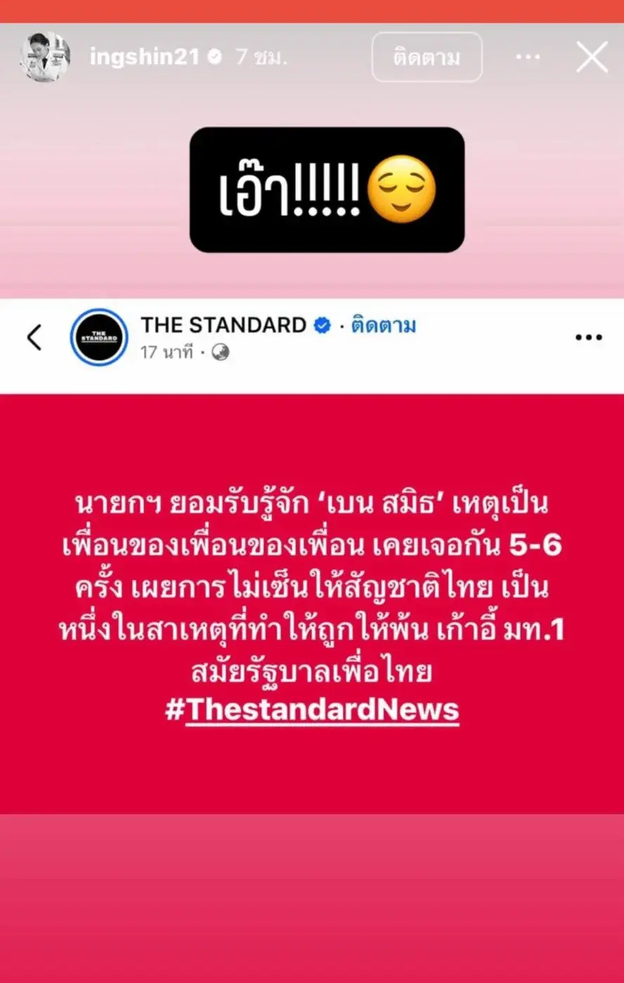 ซึ่งจากคำกล่าวของท่านนายกรัฐมนตรีนี้เองล่าสุดก็เลยมีความเคลื่อนไหวผ่านโซเชียล IG ของอดีตนายกแพทองธารที่ได้ออกมาแชร์ข้อความที่ระบุว่า นายกฯยอมรับรู้จักเบนสมิธ เหตุเป็นเพื่อนของเพื่อนเคยเจอกัน 5-6 ครั้ง เผยการไม่เซ็นสัญชาติไทยให้ เป็นหนึ่งที่สาเหตุที่ทำให้ถูกพ้นตำแหน่ง มท. 1 ซึ่งในข้อความนี้เองตัวของอดีตท่านนายกได้ระบุคำอุทานสั้นๆว่า เอ๊า ซึ่งข้อความนี้เรียกได้ว่าสั่นสะเทือนทั่ววงการโซเซียล เลย