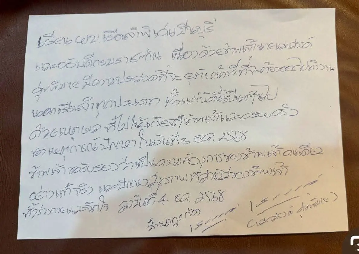 ด้วยเหตุผลที่ไม่ให้เกียรติข้าพเจ้าและครอบครัวจากเหตุการณ์ปัญหาในวันที่ 3 ธ.ค.2568 ข้าพเจ้าขอรับรองว่า เป็นความต้องการของข้าพเจ้าคนเดียวอย่างแท้จริง และปัญหาสุขภาพที่สาหัสของข้าพเจ้า ทั้งร่างกายและจิตใจ ลงวันที่ 4 ธ.ค.2568