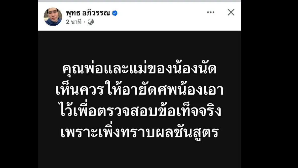 ความเคลื่อนไหวล่าสุดนี้ถูกเปิดเผยผ่านโพสต์ของ คุณพุทธ อภิวรรณ ที่ได้แจ้งข่าวและแสดงความอาลัย โดยระบุถึงการแสดงความเห็นที่ให้เกียรติผู้เสียชีวิต พร้อมยืนยันถึงความมุ่งมั่นที่จะหาความจริงให้ปรากฏร่วมกับ คุณธนกฤต จิตอารีย์รัตน์ คุณหมอ และเจ้าหน้าที่ตำรวจ ซึ่งตอกย้ำถึงความไม่ชอบมาพากลบางอย่างที่อาจซ่อนอยู่เบื้องหลังการเสียชีวิตในครั้งนี้