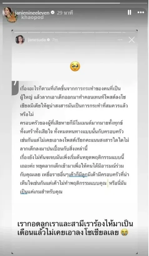 ทั้งนี้ สาวเจนสุดา ก็บอกว่า เรื่องอะไรก็ตามที่เกิดจากการกระทำของพวกผู้ใหญ่ แล้วลากเด็กเข้ามาเกี่ยวข้องนั้น เพื่อทำให้มันดูน่าสงสาร มันเป็นการกระทำที่สมควรแล้วหรือไม่ ครอบครัวของบรรดาผู้ที่เสียหาย พวกเขาก็มีโมเมนต์ต่างๆ มากมาย ทั้งทุกข์ ทั้งเศร้า ทั้งเสียใจ อีกทั้งยังหมดหนทางแบบนั้น แต่ครอบครัวเหยื่อคนอื่นๆ เขาไม่เคยเอามาโพสต์เรียกคะแนนสงสารใดๆ ไม่ลากเด็กลงมาปนเปื้อนกับสิ่งเหล่านี้ หยุดพฤติกรรมแบบนี้เถอะ เรื่องยันไม่ทันจะจบมันแค่เพิ่งเริ่มต้น หยุดลากเด็กเข้ามาเกี่ยวข้องให้คนได้มีอารมณ์ร่วมกับคุณเลย เพราะเหยื่อคนอื่นๆ เขาก็มีครอบครัวที่น่าเห็นใจเช่นกัน หรือนี่มันเป็นแค่เกมสำหรับคุณ