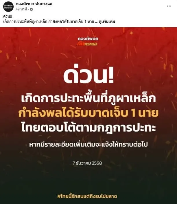 เกิดเหตุปะทะในพื้นที่ ภูผาเหล็ก ส่งผลให้กำลังพลได้รับบาดเจ็บ 2 นาย โดยฝ่ายไทยดำเนินการตอบโต้ภายใต้กฎการปะทะ (ROE) อย่างเคร่งครัด พร้อมย้ำว่าหากมีข้อมูลเพิ่มเติมจะรายงานให้ทราบต่อไป