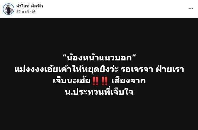 ทางเฟสบุ๊ก จ่าไอซ์ ทัพฟ้า ออกมาโพสต์ ว่า “น้องหน้าแนวบอก” แม่งงงงเอ้ยเค้าให้หยุดยิงว่ะ รอเจรจา ฝ่ายเราเจ็บนะเฮ้ย เสียงจาก น.ประทวนที่เจ็บใจ