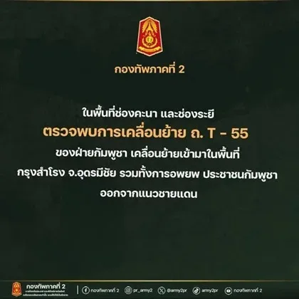 ทั้งนี้ทางเพจเฟซบุ๊ก "กองทัพภาคที่ 2" ก็ระบุว่า ในพื้นที่ช่องคะนา และช่องระยี ก็ตรวจพบมีการเคลื่อนย้าย รถถัง. T - 55 ของฝ่ายกัมพูชาเข้ามาในพื้นที่ กรุงสำโรง จ.อุดรมีชัย และได้อพยพประชาชนกัมพูชาออกจากแนวชายแดนแล้ว ส่วนในพื้นที่ช่องบก และช่องอานม้า ก็ตรวจพบการเคลื่อนย้าย จลก. RM – 70 เข้ามาในพื้นที่ อ.จอมกระสาน จ.พระวิหาร และได้อพยพประชาชนกัมพูชาออกจากแนวชายแดนแล้วเช่นกัน