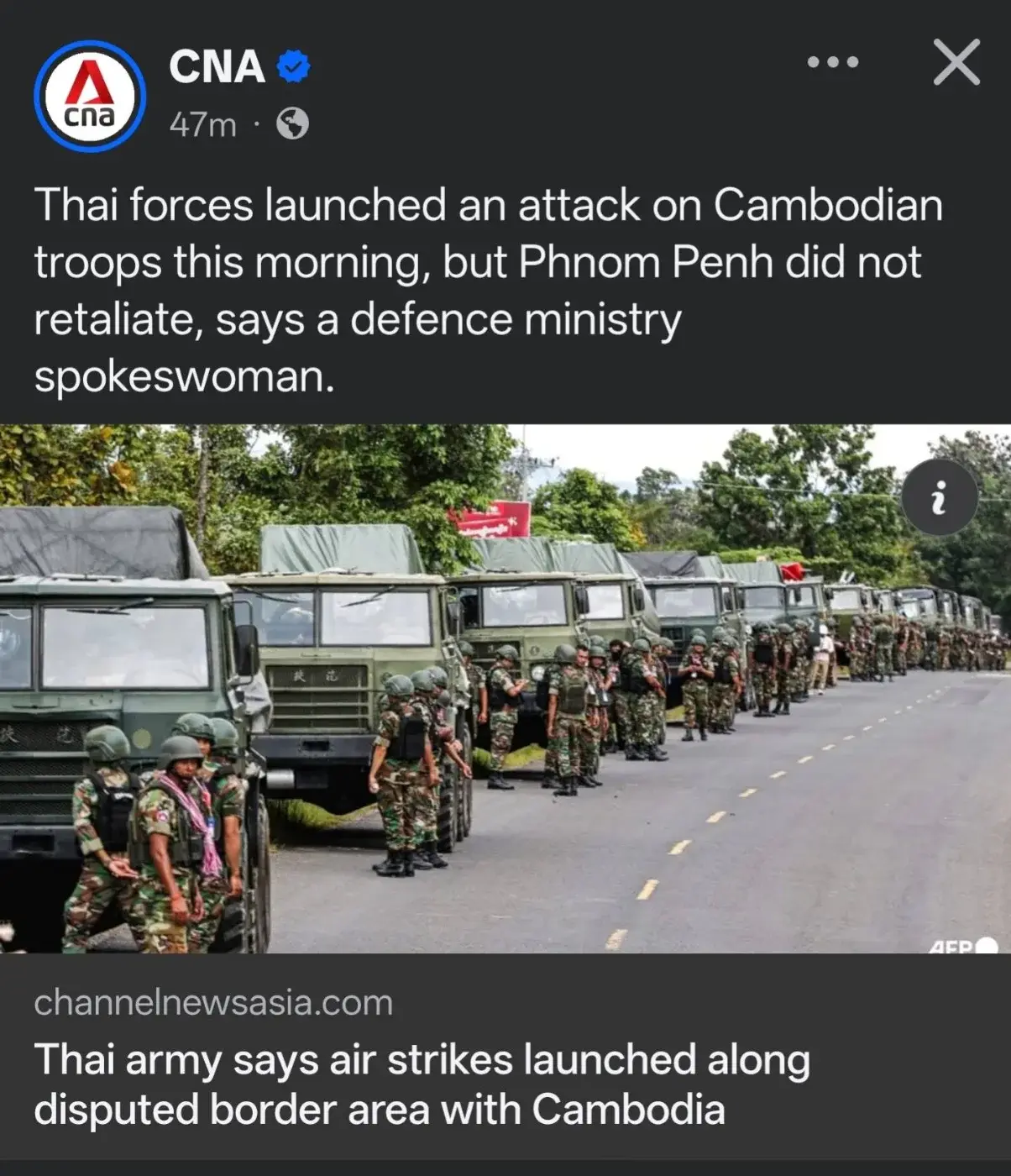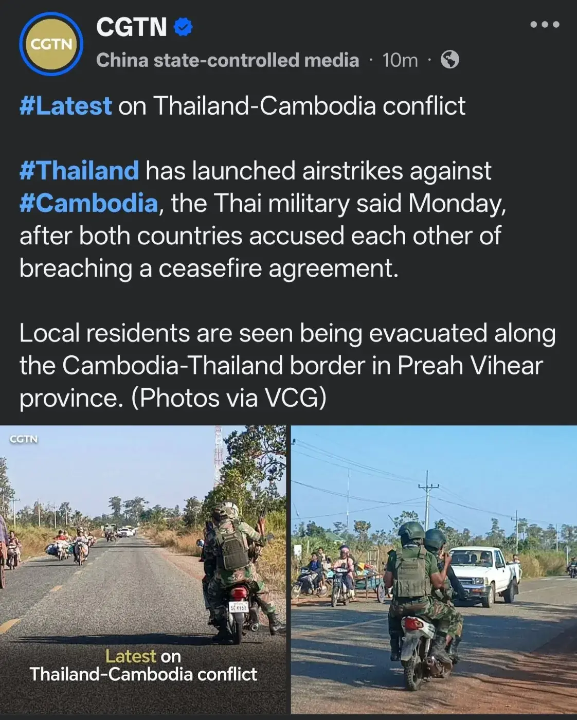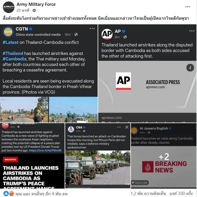 เพจเฟสบุ๊ก "Army Military Force" ได้โพสต์ว่า "สื่อดังระดับโลกร่วมกันรายงานข่าวเข้าข้างเขมรทั้งหมด บิดเบือนและกล่าวหาไทยเป็นผู้เปิดฉากโจมตีกัมพูชา" พร้อมอัพภาพอ้างอิงมากมาย ซึ่งแสดงให้เห็นว่าสื่อนอกไร้จรรยาบรรณ