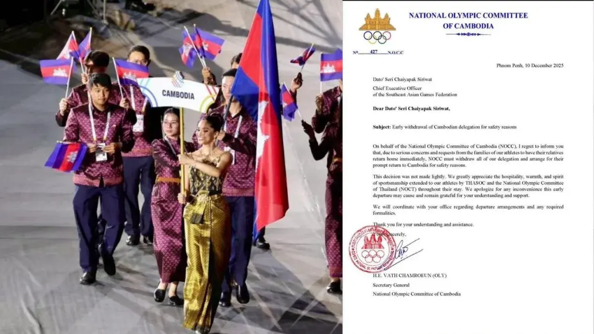 ท่ามกลางกระแสความตึงเครียดตามแนวชายแดนไทย-กัมพูชาที่ทวีความรุนแรงขึ้นในช่วงไม่กี่วันที่ผ่านมา ล่าสุดคณะกรรมการโอลิมปิกแห่งชาติกัมพูชา (NOCC) ได้ออกแถลงการณ์อย่างเป็นทางการถึงเหตุผลในการตัดสินใจถอนทัพนักกีฬาและเจ้าหน้าที่ทั้งหมดออกจากการแข่งขันซีเกมส์ 2025 ทั้งที่เพิ่งเข้าร่วมพิธีเปิดไปเมื่อวันที่ 9 ธันวาคม โดยยืนยันว่าการตัดสินใจดังกล่าวเป็นไปตามคำร้องขอของครอบครัวนักกีฬาที่แสดงความวิตกกังวลต่อสถานการณ์ความปลอดภัย