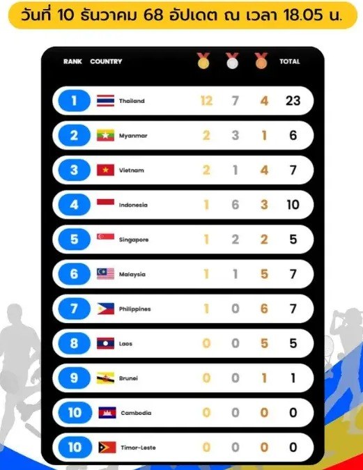 การแข่งขันกีฬาซีเกมส์ ครั้งที่ 33 ซึ่งจัดขึ้นระหว่างวันที่ 9 - 20 ธันวาคม พ.ศ. 2568 ได้เริ่มต้นขึ้นอย่างดุเดือด โดยผลสรุปเหรียญล่าสุด ณ เวลา 18:00 น. ของวันที่ 10 ธันวาคม 2568 ยืนยันว่าทัพนักกีฬาไทยแสดงศักยภาพได้อย่างยอดเยี่ยมและผงาดขึ้นนำเป็นจ่าฝูงของตารางเหรียญรวมได้อย่างแข็งแกร่ง