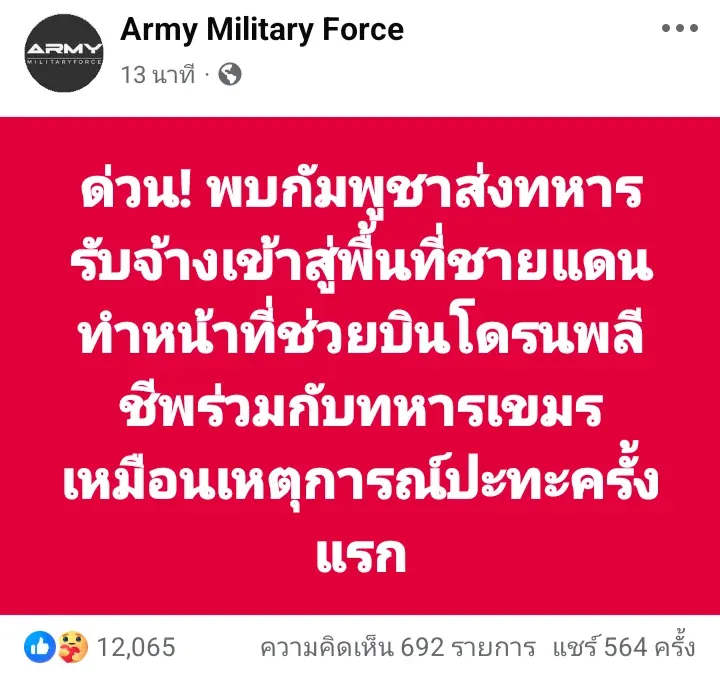 สวัสดีชาว rollwithus กันทุกคน เมื่อกี้ทางเพจ Army Military Force ได้ออกมาโพสต์ ข้อความว่า พบกัมพูชาส่งทหาร รับจ้างเข้าสู่พื้นที่ชายแดน ทำหน้าที่ช่วยบินโดรนพลี ชีพร่วมกับทหารเขมร เหมือนเหตุการณ์ปะทะครั้ง แรก