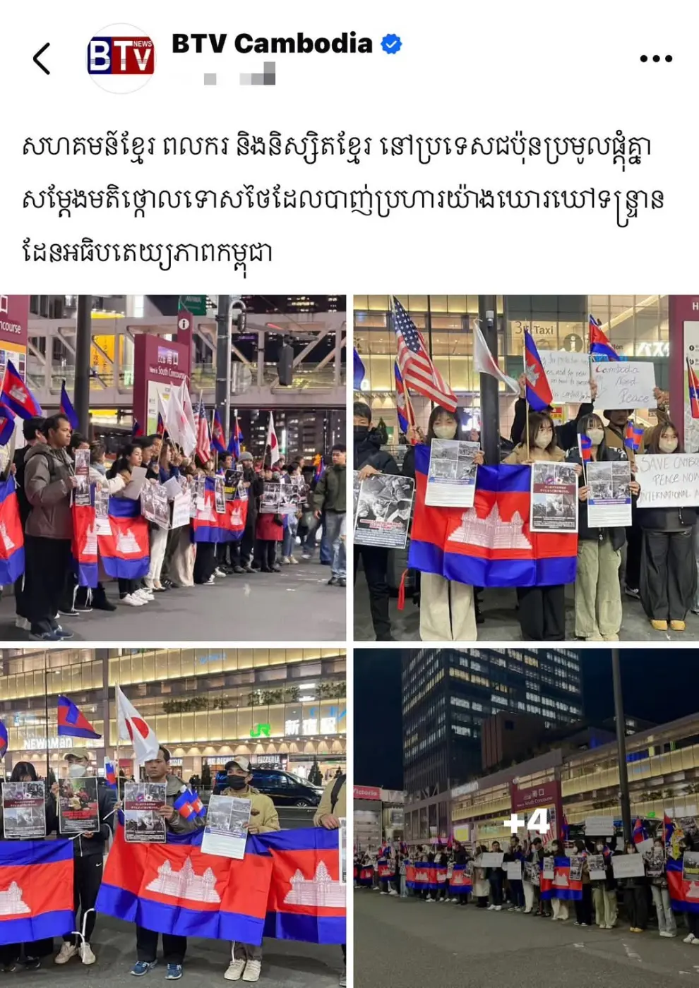 ล่าสุดสำนักข่าวชื่อดังกัมพูชา “btv cambodia” โพสต์ภาพพร้อมกำกับข้อความระบุว่า“ชาวกัมพูชา แรงงาน และนักศึกษาในญี่ปุ่นรวมตัวกัน เพื่อประณามการยิงอย่างโหดร้ายและการรุกรานอธิปไตยของกัมพูชาโดยประเทศไทย” จากกรณีที่สื่อดังของกัมพูชา ได้ออกมารายงาน ข่าวนี้ถือว่าเป็น ข่าวปลอมเนื่องจากไทยไม่เคยไป รุกรานอธิปไตยของกัมพูชาแต่อย่างใด มีแต่กัมพูชาที่พยายามลุกเข้ามาในพื้นที่อธิษฐานไทยและเมื่อเป็นเช่นนั้นแล้วไทยก็ไม่สามารถหลบหนีบการปะทะกัมพูชาได้เนื่องจากใครต้องปกป้องพื้นที่อธิปไตยของตนเอง