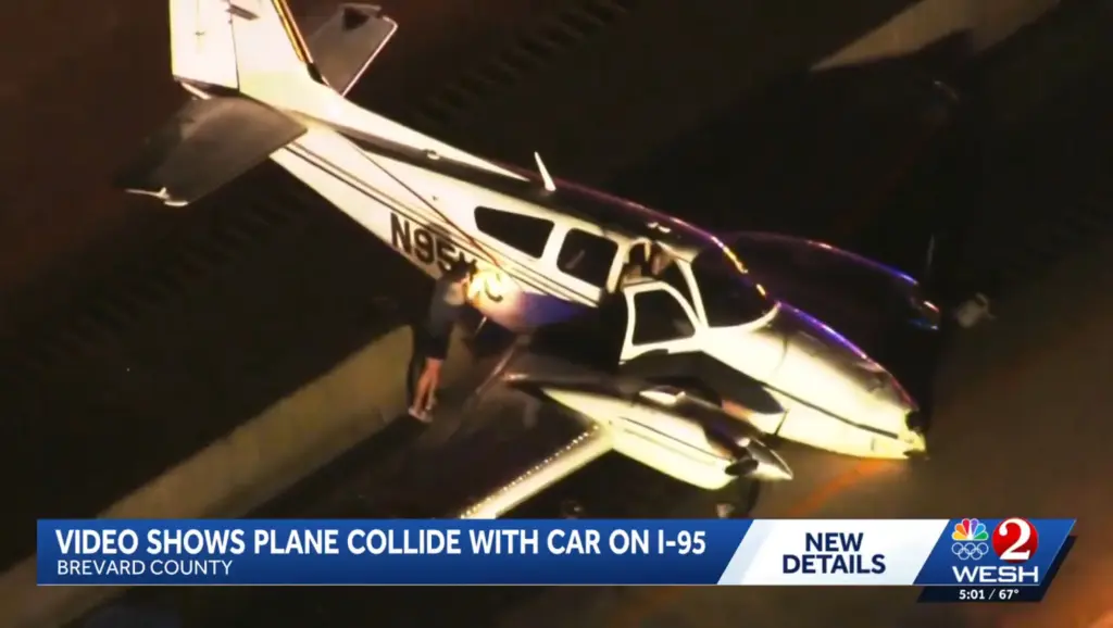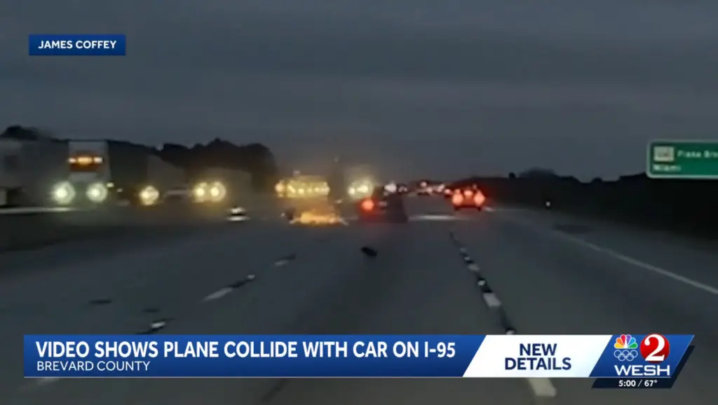 เจ้าหน้าที่ทางหลวงรัฐฟลอริดา กล่าวว่า "เครื่องบินแบบ "ปีกคงที่หลายเครื่องยนต์" ตกลงมาชนรถยนต์ "โตโยต้า แคมรี่" ปี 2023 บนช่องทางขาใต้ของทางหลวง "ไอ-95" ใกล้เมืองโคโค รัฐฟลอริดา ประเทศอเมริกา เวลาประมาณ 17.45 น. [ตามเวลาท้องถิ่น]"
