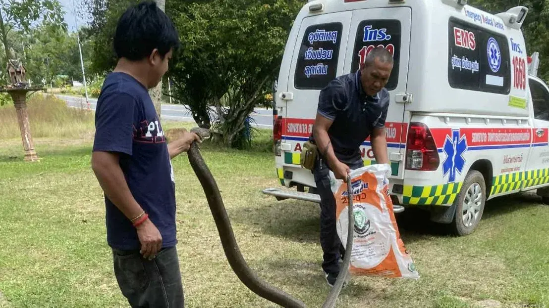 จนท.ต้องใช้ตะขอเกี่ยวลำตัวดึงออกมา แต่จังหวะนั้นงูจงอางรู้สึกหงุดหงิดชูแม่เบี้ยจะพุ่งเข้าใส่ โชคดีลำตัวคล้องติดอยู่กับชั้นวางของ จนท.จึงใช้จังหวะที่ได้เปรียบก่อนรีบคล้องคอ แล้วใช้มือคว้าคอไว้ได้ นำออกลานกว้างวัดความยาว 3.50เมตร หนัก 6 กิโลกรัม ยัดใส่กระสอบนำปล่อยคืนสู่ป่า