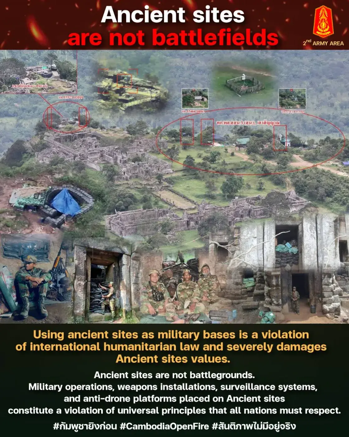 เป็นภาพที่เพจกองทัพภาคที่ 1 เผยแพร่—ภาพ ปราสาทพระวิหาร ซึ่งควรเป็นโบราณสถานมรดกโลกที่คนทั้งภูมิภาคให้ความเคารพ กลับถูกดัดแปลงจน คล้ายเป็นสนามรบเต็มตัว มีทั้งการติดตั้งอุปกรณ์ทางทหาร กล้องตรวจการณ์ ระบบแอนตี้โดรน รวมถึงโครงสร้างต่าง ๆ ที่ดูไม่เหมาะสมกับสถานที่ซึ่งควรได้รับการอนุรักษ์เป็นที่สุด