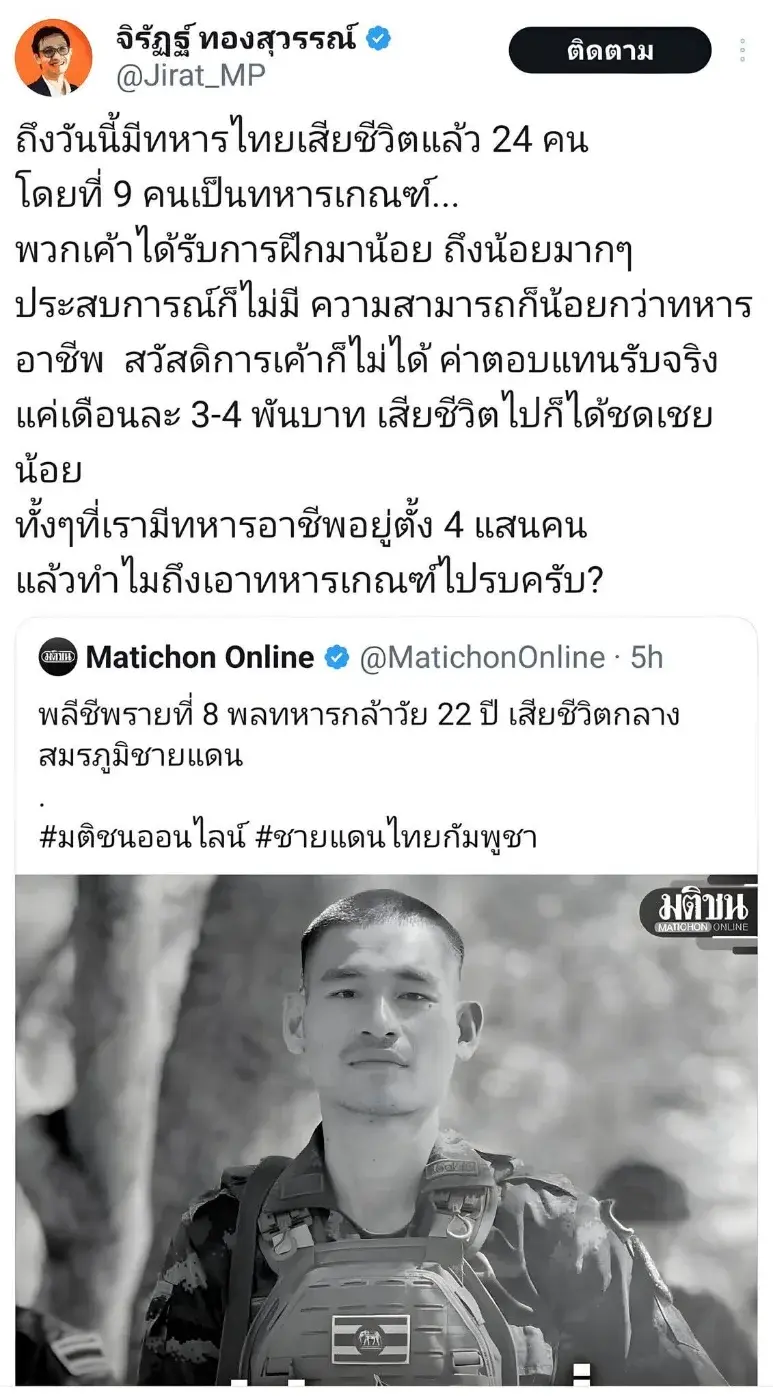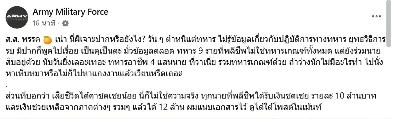 เพจดังเดือด สวน "ส.ส.ส้ม" มั่วข้อมูลทหาร ลั่น 9 ชีวิตพลีชีพ ได้ค่าชดเชย "12 ล้านบาท" ไม่ใช่แค่น้อยนิด