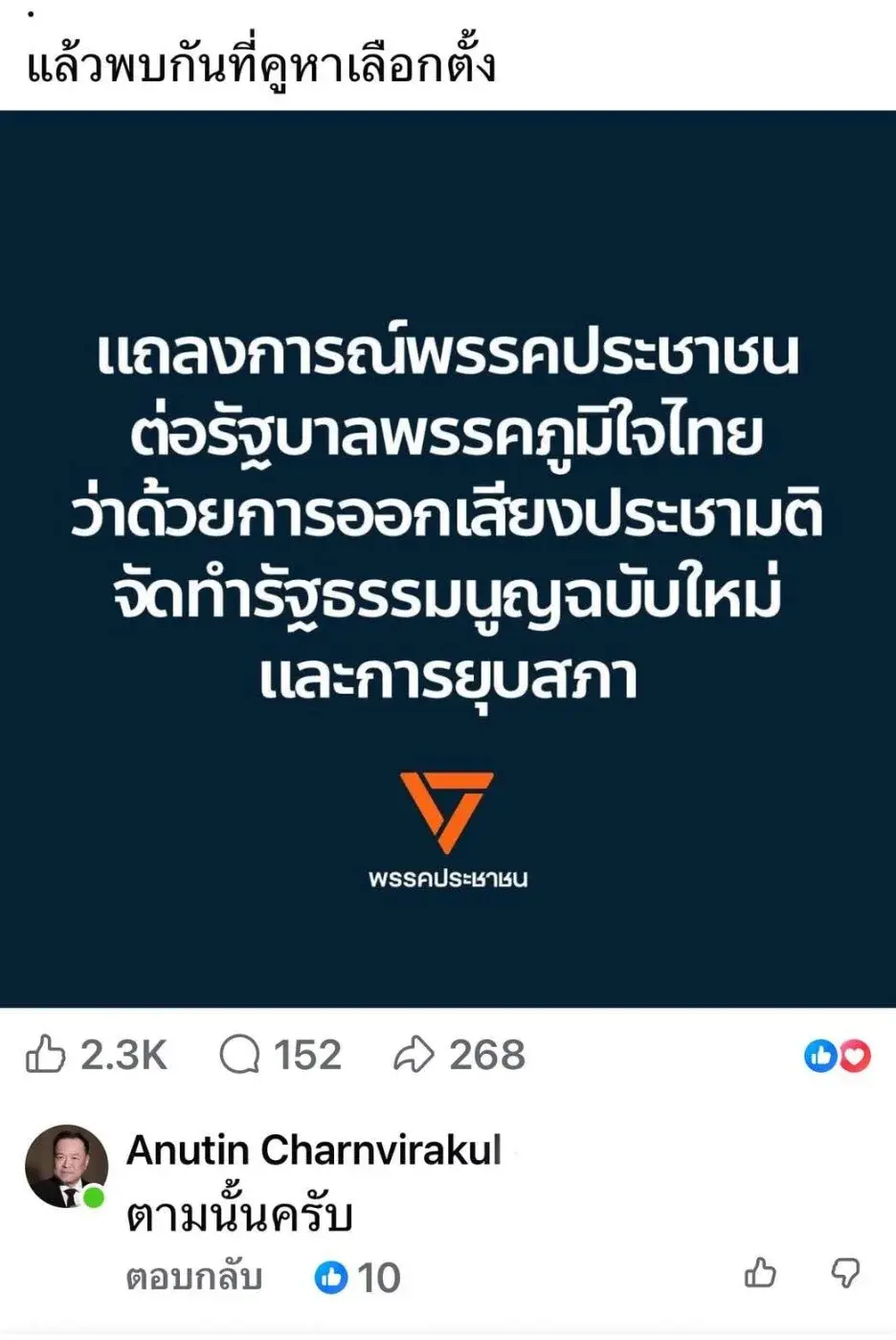 วันที่ 12 ธ.ค. 2568 นายอนุทิน ชาญวีรกูล นายกรัฐมนตรีและรัฐมนตรีว่าการกระทรวงมหาดไทย ได้แสดงความคิดเห็นในเพจพรรคประชาชนว่า “ตามนั้นครับ” หลังจากที่พรรคประชาชนออกแถลงการณ์เกี่ยวกับการจัดทำรัฐธรรมนูญใหม่และการยุบสภา โดยมีเนื้อหาว่า การลงมติแก้ไขรัฐธรรมนูญวาระ 2 มีความเห็นแตกต่างกันเกี่ยวกับการใช้เสียง ส.ว. 1 ใน 3 ในการผ่านร่างรัฐธรรมนูญใหม่ ซึ่งทำให้ ส.ว. ควบคุมเนื้อหาของรัฐธรรมนูญตั้งแต่ต้นทาง