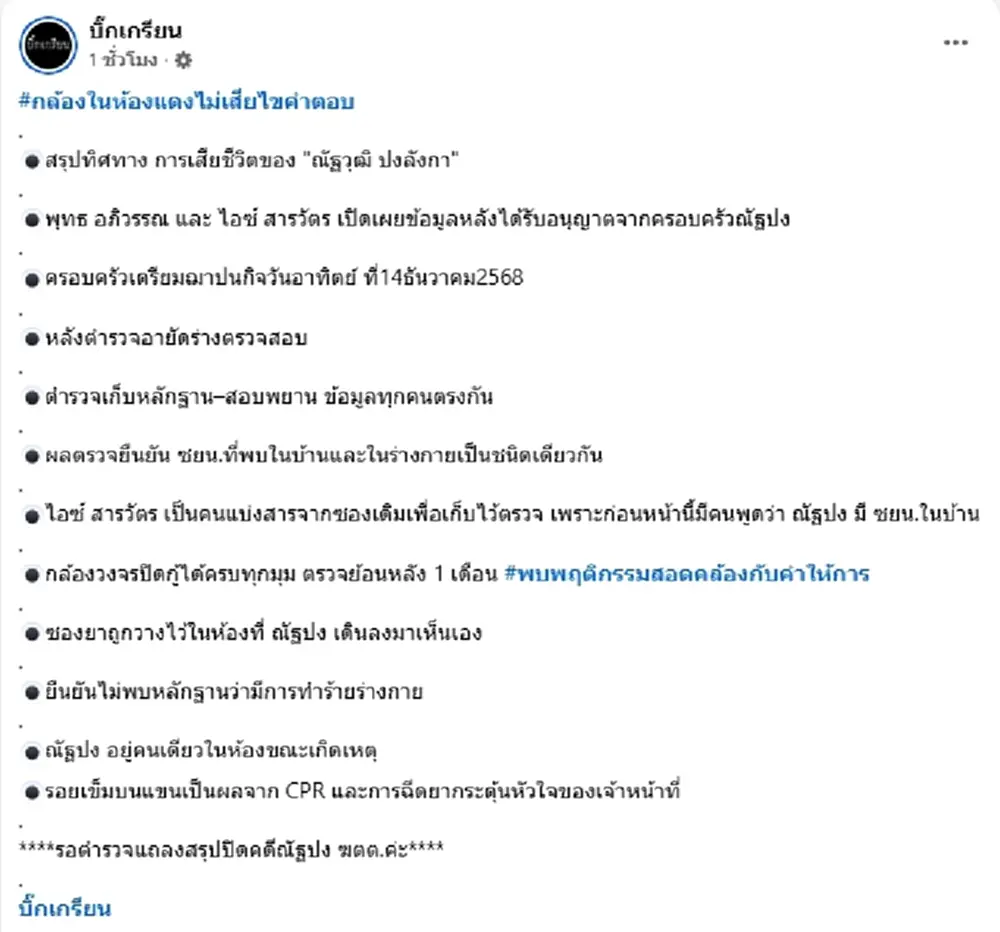 ทางด้าน "ไอซ์ สารวัตร" เพื่อนร่วมงานของ นัท ณัฐวุฒิ ก็โพสท์ลงเฟซบุ๊กว่า...บทสรุปคดี "พี่นัทปง" หลักฐานชัดแล้ว พี่เขาเลือกไปอย่างสงบ กล้องในห้องเห็นทุกอย่าง