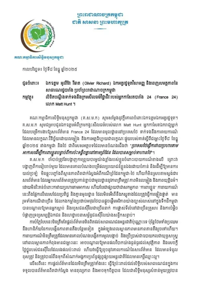 คณะกรรมการสิทธิฯกัมพูชา จึงขอให้เอกอัครราชทูตแจ้ง France 24 แก้ไขเนื้อหาโดยทันที และขอให้การรายงานข่าวเป็นไปตามมาตรฐานและคำนึงถึงสิทธิมนุษยชนเขมรด้วย