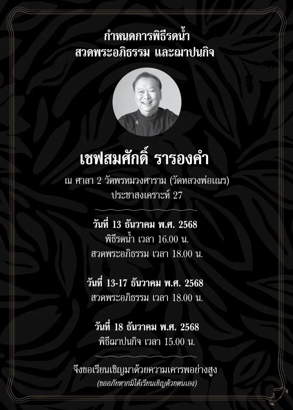 อาลัย เชฟสมศักดิ์ รารองคำ นายกสมาคมเชฟประเทศไทย เสียชีวิตอย่างสงบ โดยสมาคมเชฟประเทศไทยได้ประกาศกำหนดการสวดพระอภิธรรมและฌาปนกิจ ณ ศาลา 2 วัดพรหมวงศาราม วันที่ 12 ธันวาคม 2568 สมาคมฯ ได้โพสต์แสดงความอาลัยต่อการจากไปของเชฟสมศักดิ์ ซึ่งเป็นผู้นำที่มีคุณค่าและเป็นที่เคารพรักของสมาชิกทุกคน