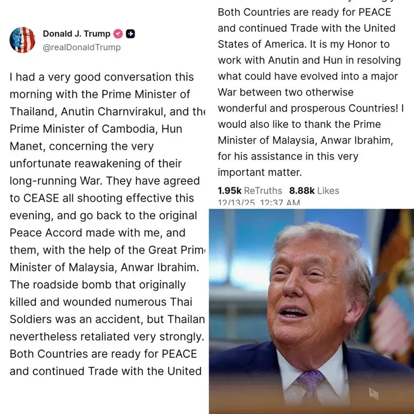 ประธานาธิบดีสหรัฐบอกว่า ได้สนทนากับ "นายอนุทิน ชาญวีรกูล" นายกฯ ไทย และ "นายฮุน มาเนต" นายกฯ กัมพูชา เกี่ยวกับประเด็นสงครามที่ยืดเยื้อมานาน โดยทั้งสองฝ่ายตกลงที่จะหยุดยิงในเย็นวันนี้ และกลับไปสู่ข้อตกลงสันติภาพตามเดิม ทั้งนี้ยังกล่าวด้วยว่าระเบิดที่ทำให้ทหารไทยได้รับบาดเจ็บและเสียชีวิตนั้นในตอนแรกเป็นแค่เพียงอุบัติเหตุ แต่ทางไทยก็ได้ตอบโต้กลับอย่างรุนแรง เรียกว่าแตกต่างอย่างสิ้นเชิงจากการให้สัมภาษณ์ของนายอนุทิน ซึ่งไม่ได้เอ่ยถึงการยุติการสู้รบเลย โดยอนุทินได้ขอให้ทรัมป์เร่งเร้าให้กัมพูชาถอนทุ่นระเบิดและเป็นฝ่ายยุติการสู้รบทันที เพราะไทยไม่ใช่ผู้รุกรานกัมพูชา แต่เรากำลังตอบโต้เพื่อป้องกันตัวเองเท่านั้น