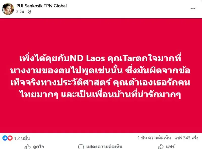 จนกระทั่ง แม่ปุ้ย ND ไทย เคลื่อนไหวผ่านเฟซบุ๊กว่า “เพิ่งได้คุยกับ คุณต้า ND Laos ตกใจมากที่นางงามของตนไปพูดเช่นนั้น ซึ่งมันผิดจากข้อเท็จจริงทางประวัติศาสตร์ คุณต้าเองเธอรักคนไทยมากๆ”