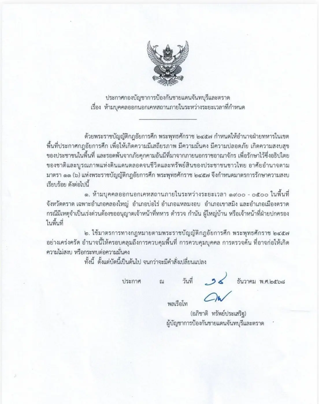 ตราด!! ประกาศเคอร์ฟิว 5 อำเภอ หลังถูกยิง M79 🛡️