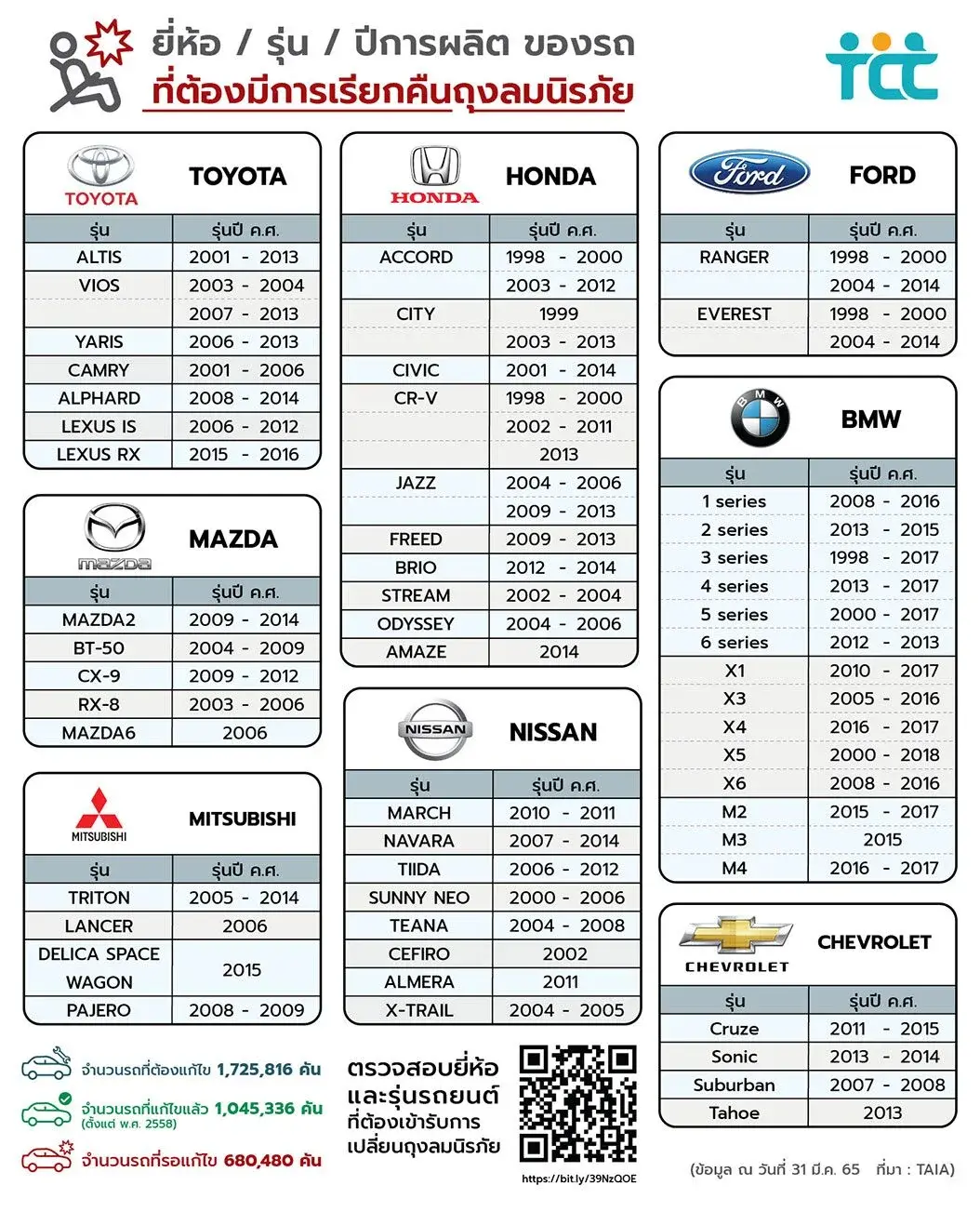 ผู้ขับรถทั้ง 8 ยี่ห้อสามารถตรวจสอบข้อมูลเกี่ยวกับการเรียกคืนถุงลมนิรภัยได้ที่ www.checkairbag.com หรือที่ศูนย์บริการของแต่ละบริษัท หรือติดต่อสายด่วน 1584 ตลอด 24 ชั่วโมง