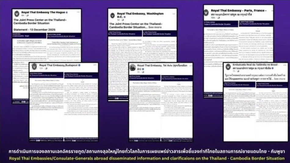 ทางด้านสถานเอกอัครราชทูตไทยทั่วโลกได้ โพสท์ข้อความแถลงการณ์นี้ ขึ้นเว็บไซต์เฟซบุ๊กสถานทูต 90 แห่งทั่วโลกพร้อมกัน เพื่อชี้แจงข้อมูลที่ถูกต้องกับสื่อต่างประเทศ ถือเป็นอีกสมรภูมิหนึ่งบนโซเชียลมีเดีย ที่ทางฝั่งไทยจําเป็นต้องนำเสนอข้อมูลที่ถูกต้อง..