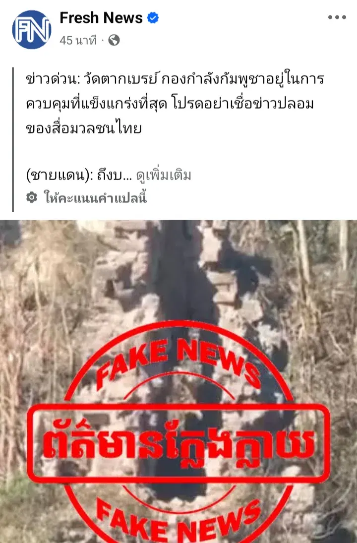แต่ ฝั่งเพจเขมรก็โผล่มาสวนแบบทันที โดยบอกชัดเจนว่าอย่าไปเชื่อข่าวของสื่อไทย เพราะกองกำลังกัมพูชายังควบคุมพื้นที่ได้อย่างแข็งแกร่งสุด ๆ