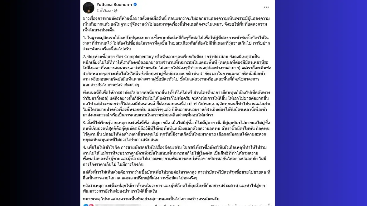 จากดราม่าร้อนแรงในโลกโซเชียลเกี่ยวกับการซื้อขายและรีเซลบัตรคอนเสิร์ต โดยเฉพาะบัตรอ่อน (Complimentary) ในเทศกาลดนตรีครั้งใหญ่ ล่าสุด ป๋าเต็ด ยุทธนา บุญอ้อม ในฐานะผู้จัดงาน ได้ออกมาโพสต์แสดงความเห็นอย่างละเอียด เพื่อชี้แจงและรับมือกับข้อวิพากษ์วิจารณ์ต่าง ๆ
