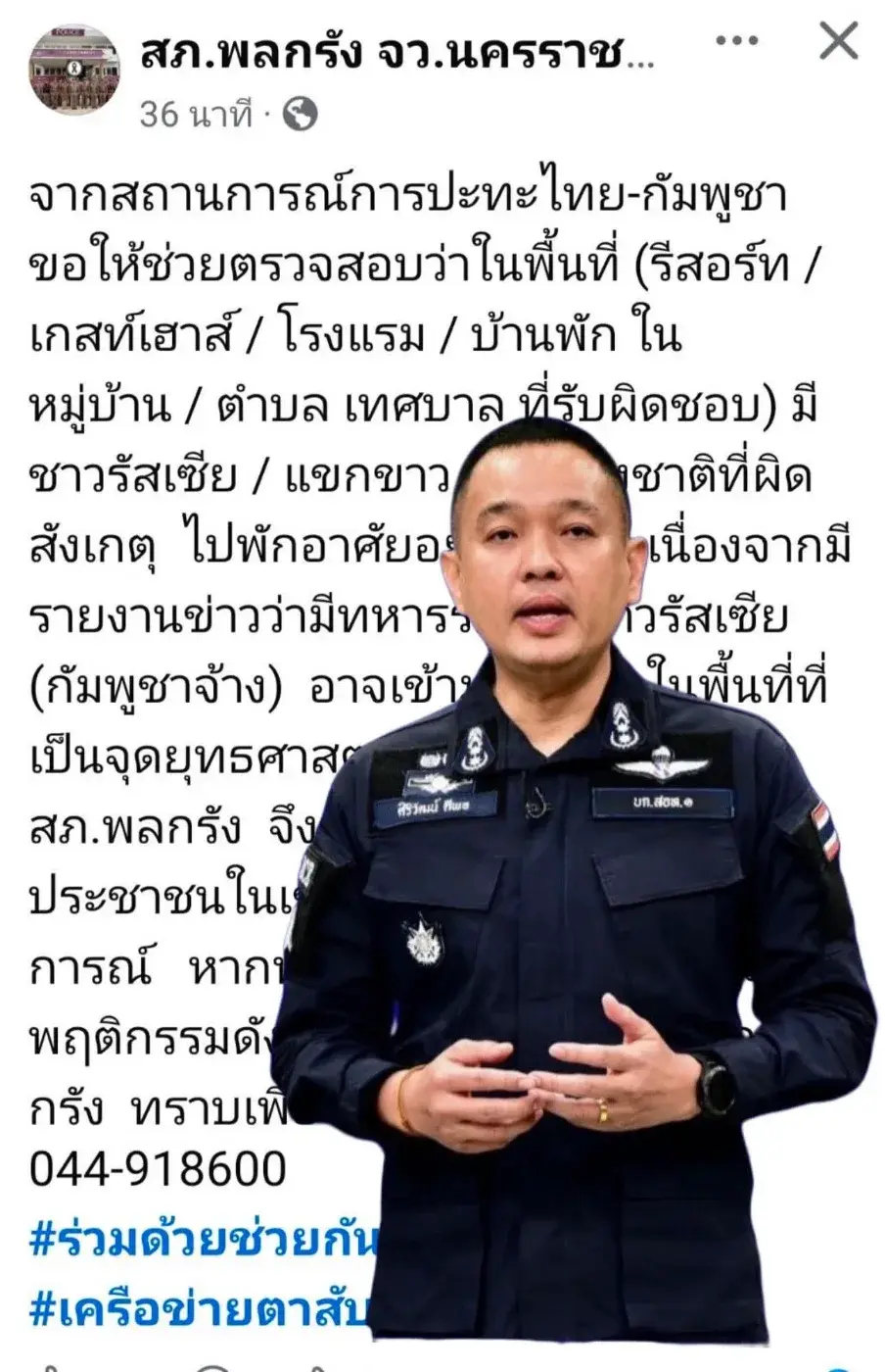 ก่อนหน้านี้คืนเดียวกัน สภ.พลกรัง จ.นครราชสีมา ก็ได้โพสต์แจ้งเตือนประชาชนในพื้นที่ ขอความร่วมมือช่วยสอดส่องดูแล หากพบ ชาวต่างชาติที่มีพฤติกรรมน่าสงสัย โดยเฉพาะตาม รีสอร์ท เกสต์เฮาส์ โรงแรม บ้านพัก หรือที่อยู่อาศัยต่างๆ ในพื้นที่รับผิดชอบ
