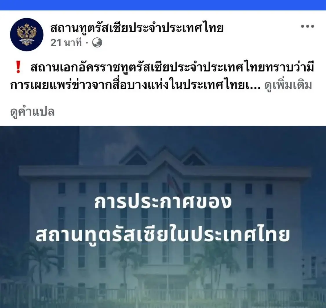 The Embassy of Russia in Thailand has taken note of reports circulating in certain Thai media outlets alleging the possible involvement of Russian nationals as mercenaries hired by the Cambodian side to participate in the Thai–Cambodian border conflict.