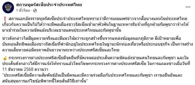 ล่าสุด (15 ธ.ค. 68) สถานเอกอัครราชทูตรัสเซียประจำประเทศไทย ได้ร่อนหนังสือชี้แจง กรณีมีข่าวว่าทหารรับจ้างรัสเซียกำลังช่วยกัมพูชาสู้รบกับไทยนั้น ไม่เป็นความจริงและคาดว่าถูกสร้างเรื่องขึ้นจากภายนอก โดยมีเป้าหมายเพื่อบั่นทอนสิทธิของนักท่องเที่ยวและนักลงทุนชาวรัสเซียที่อาศัยอยู่ในประเทศไทย สร้างความเสียหายต่อมิตรภาพระหว่างประเทศ