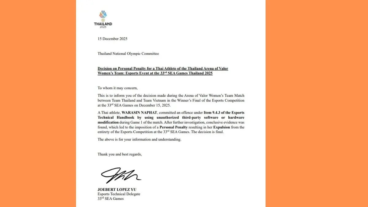 วงการอีสปอร์ตไทยเผชิญหน้ากับประเด็นร้อนแรงอย่างหนัก ในการแข่งขันซีเกมส์ครั้งที่ 33 เมื่อมีรายงานว่า นางสาวณภัทร วราสินธ์ หรือ "Tokyogurl" เพลเยอร์คนสำคัญของทีม RoV หญิงทีมชาติไทย ถูกสมาคมกีฬาอีสปอร์ตแห่งประเทศไทย (TESF) สั่งขับออกจากการแข่งขันอย่างเป็นทางการ หลังพบการกระทำผิดร้ายแรงด้าน Fair Play ซึ่งทำให้บรรยากาศในการแข่งขันรอบชิงเหรียญทองของทีมชาติไทยเกิดความสั่นคลอนอย่างรุนแรง