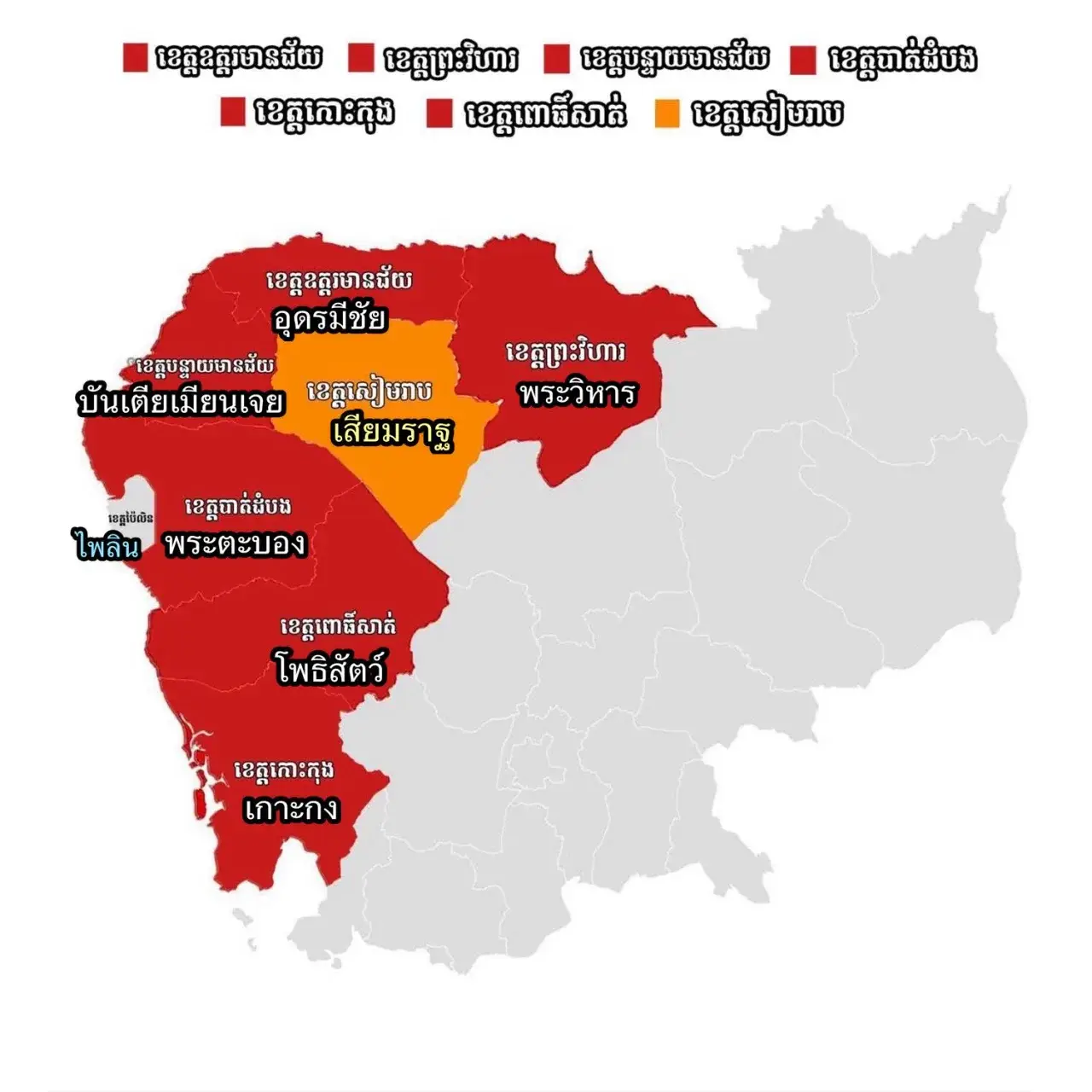 กัมพูชาประกาศ “พื้นที่สีแดง” พร้อมกันถึง 6 จังหวัด—เกาะกง โพธิสัตว์ พระตะบอง บันเตียเมียนเจย อุดรมีชัย และพระวิหาร ชื่อจังหวัดเหล่านี้อาจคุ้นหูเราบ้าง ไม่คุ้นบ้าง แต่สำหรับคนที่อยู่ตรงนั้น มันคือบ้าน คือชีวิต คือที่ที่เคยสงบ ก่อนจะถูกระบายเป็นสีแดงบนแผนที่อย่างเย็นชา สีที่บอกเป็นนัยว่า “อันตรายกำลังคืบคลาน”