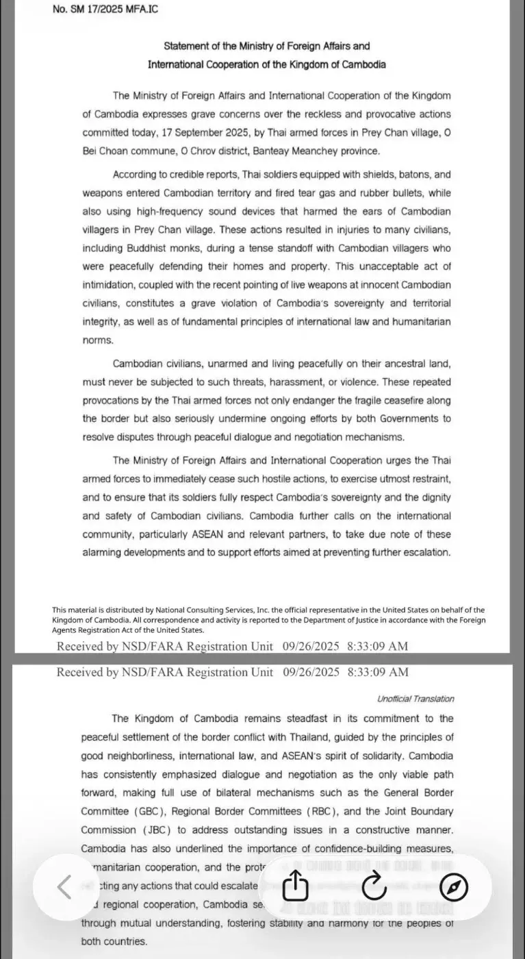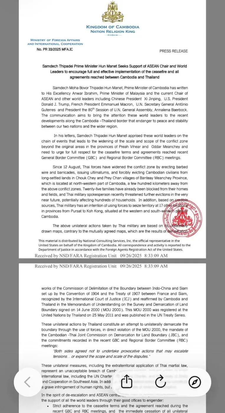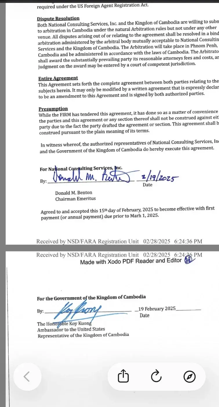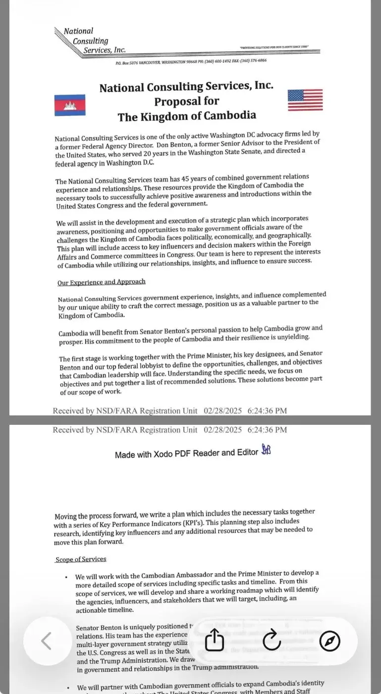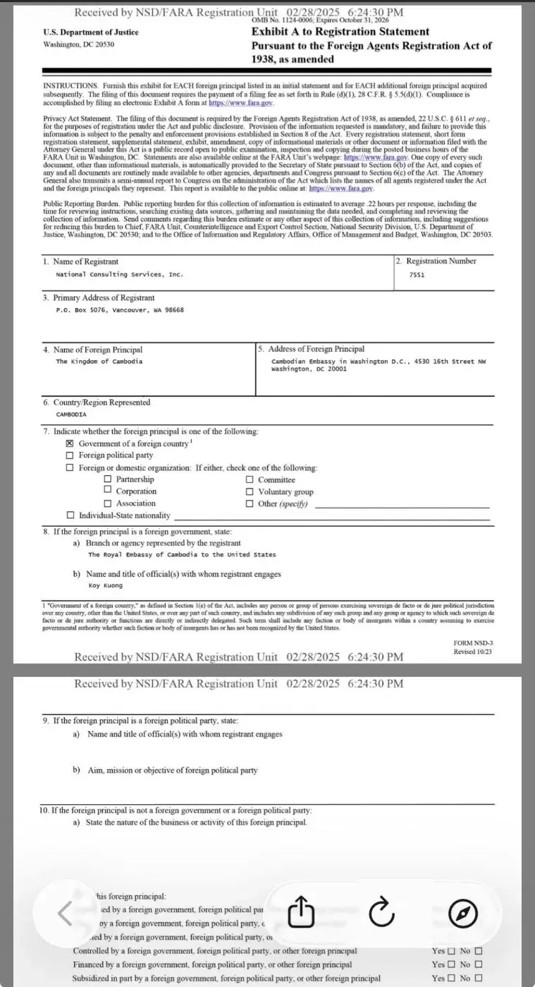 เอกสารชุดนี้เป็นเอกสารที่ถูกยื่นอย่างถูกต้องตามกฎหมายของสหรัฐฯ และมีการเปิดเผยต่อสาธารณะ โดยระบุชัดว่า รัฐบาลกัมพูชาจ้างบริษัทอเมริกันแห่งหนึ่ง เพื่อทำหน้าที่สื่อสารกับผู้นำโลก องค์กรระหว่างประเทศ และหน่วยงานนานาชาติต่าง ๆ