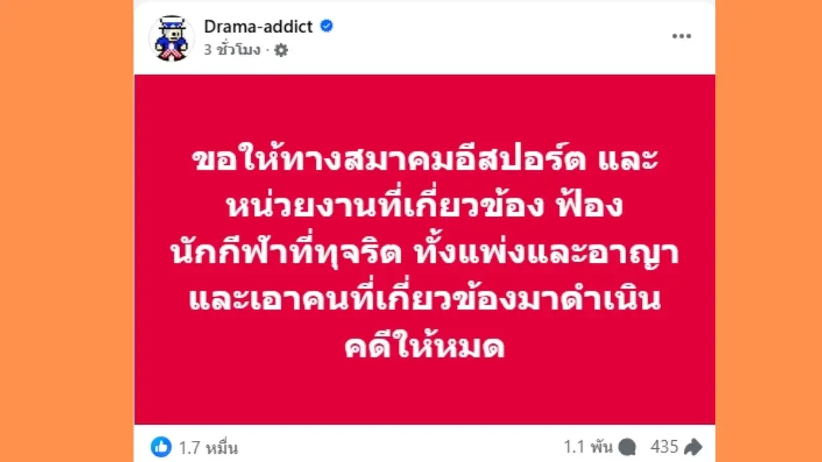"Drama-addict" จี้ฟ้อง: เพจดังได้ออกมาเรียกร้องให้สมาคมกีฬาอีสปอร์ตและหน่วยงานที่เกี่ยวข้อง ดำเนินคดีฟ้องร้องนักกีฬาที่ทุจริตทั้งทางแพ่งและอาญา รวมถึงผู้ที่มีส่วนเกี่ยวข้องทั้งหมด เพื่อให้บทลงโทษมีความเข้มข้นและเป็นบทเรียนที่เด็ดขาด