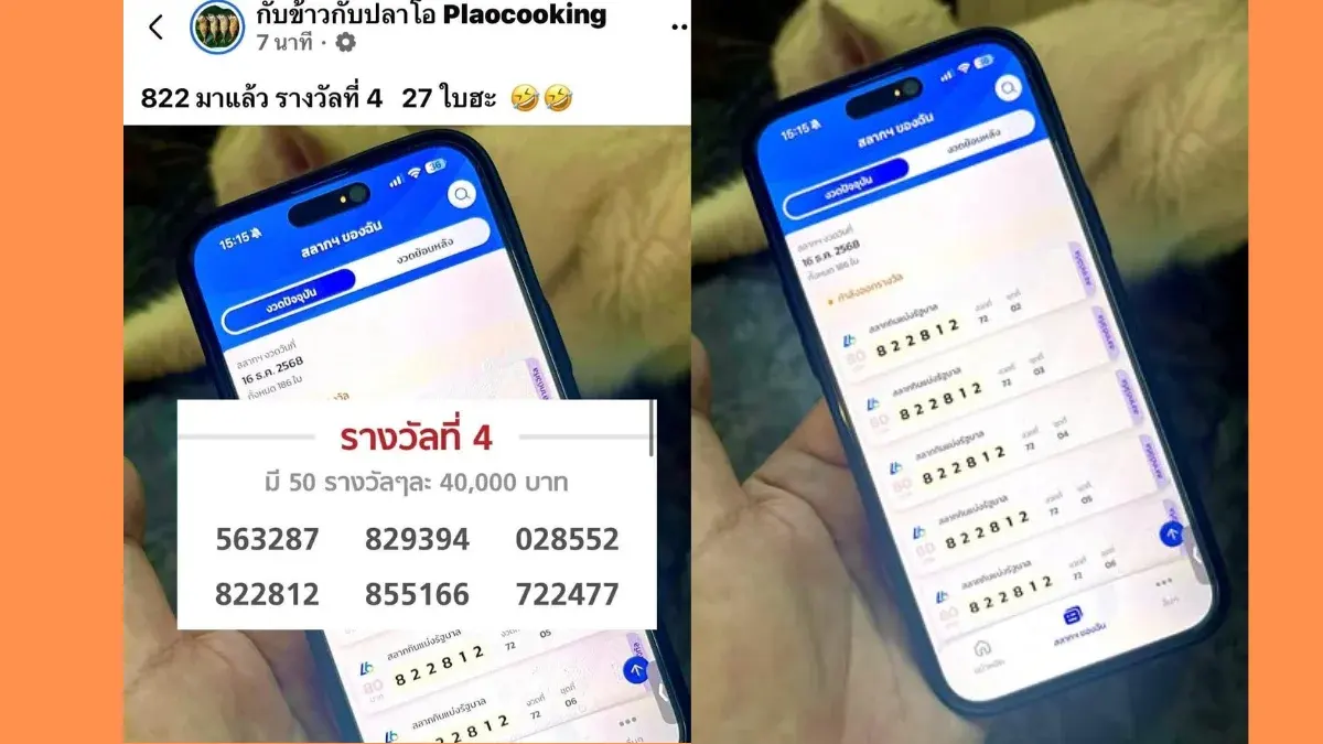 เพจ "กับข้าวกับปลาโอ" ได้โพสต์ภาพสลากดิจิทัลจำนวน 27 ใบ ที่มีหมายเลข 822812 ซึ่งเป็นเลขที่ตรงกับรางวัลที่ 4 ในงวดนี้พอดี พร้อมระบุแคปชั่นอย่างอารมณ์ดีว่า "822 มาแล้ว รางวัลที่ 4 27 ใบฮะ"