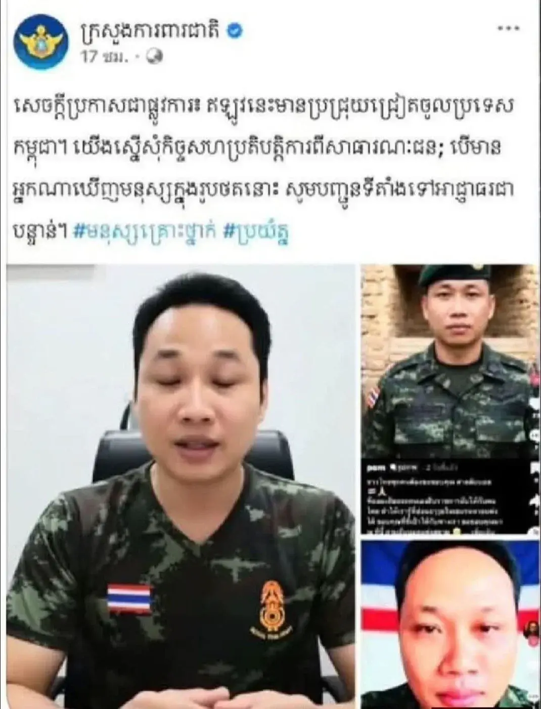 กระทรวงกลาโหมเขมรโพสต์บักบอยเขมรเป็นสายลับแทรกซึมเข้ามาในประเทศขอความร่วมมือประชาชนพบเห็นแจ้งเจ้าหน้าที่รัฐ ทันที