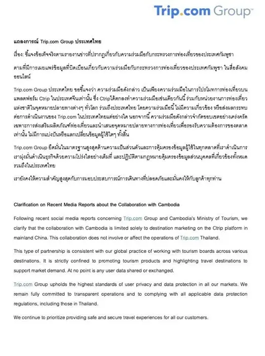 เมื่อวันที่ 17 ธ.ค.68 ทาง Trip.com Group ประเทศไทย ได้ออกมาแถลงการณ์ เพื่อชี้แจงข้อเท็จจริง หลังมีรายงานข่าวว่าได้ไปร่วมมือกับกระทรวงการท่องเที่ยวของประเทศกัมพูชา โดยระบุว่า ตอนนี้มีข้อมูลบิดเบือนเกี่ยวกับความร่วมมือกับกระทรวงการท่องเที่ยวของกัมพูชาได้เผยแพร่ในสื่อสังคมออนไลน์ ดังนั้นทาง Trip.com Group ประเทศไทย จึงขอชี้แจงว่า ความร่วมมือดังกล่าวนั้นเป็นเพียงความร่วมมือในการโปรโมตการท่องเที่ยวบนแพลตฟอร์ม Ctrip ในประเทศจีนเท่านั้น